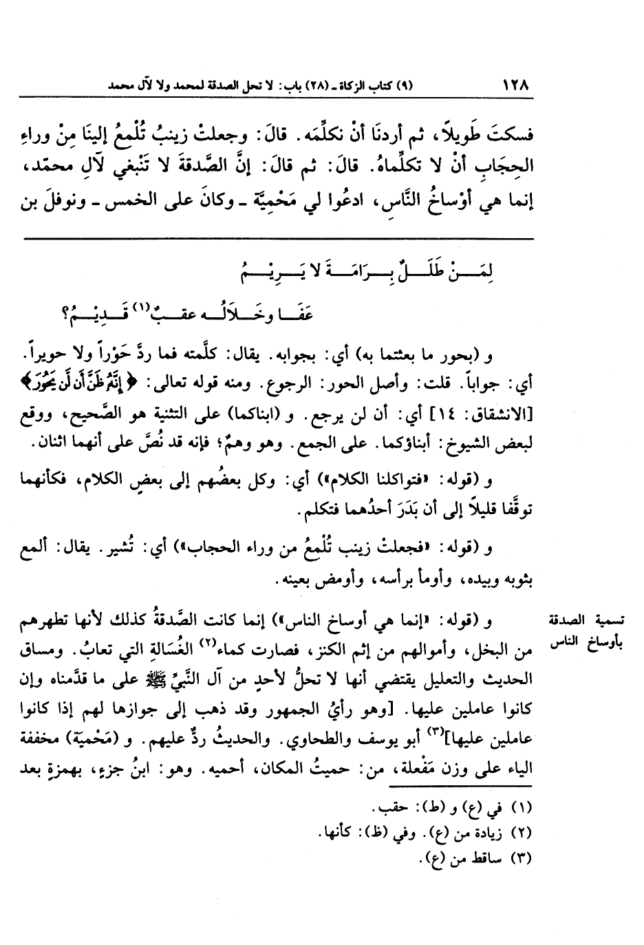 ومساق الحديث والتعليل يقتضي أنها لا تحل لأحد من آل النبي - صلى الله عليه وسلم - على ما قدمناه، وإن كانوا عاملين عليها، وهو رأي الجمهور وقد ذهب إلى جوازها لهم إذا كانوا عاملين عليها (¬3)؛ أبو يوسف والطحاوي، والحديث ردّ عليهم.
