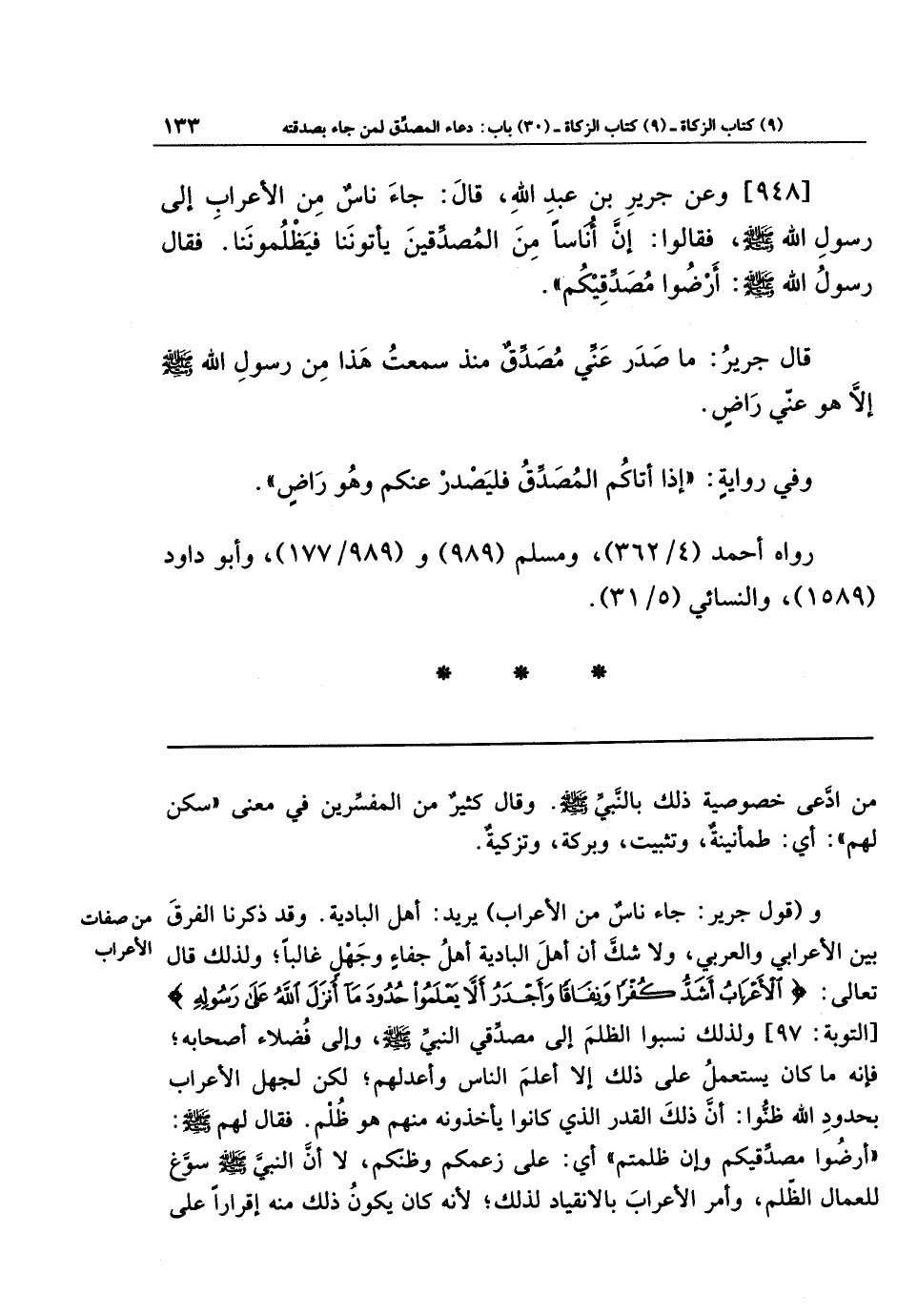 [948] وَعَن جَرِيرِ بنِ عَبدِ اللهِ قَالَ: جَاءَ نَاسٌ مِنَ الأَعرَابِ إِلَى رَسُولِ اللهِ - صلى الله عليه وسلم - فَقَالُوا: إِنَّ أنَاسًا مِنَ المُصَدِّقِينَ يَأتُونَنَا فَيَظلِمُونَنَا، فَقَالَ رَسُولُ اللهِ - صلى الله عليه وسلم -: (أَرضُوا مُصَدِّقِيكُم).