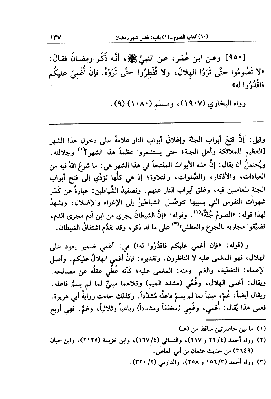 [950] وَعَن ابنِ عُمَرَ عَن النَّبِيِّ -صَلَّى اللَّهُ عَلَيهِ وَسَلَّمَ- أَنَّهُ ذَكَرَ رَمَضَانَ فَقَالَ: لَا تَصُومُوا حَتَّى تَرَوا الهِلَالَ، وَلَا تُفطِرُوا حَتَّى تَرَوهُ، فَإِن أُغمِيَ عَلَيكُم فَاقدرُوا لَهُ.