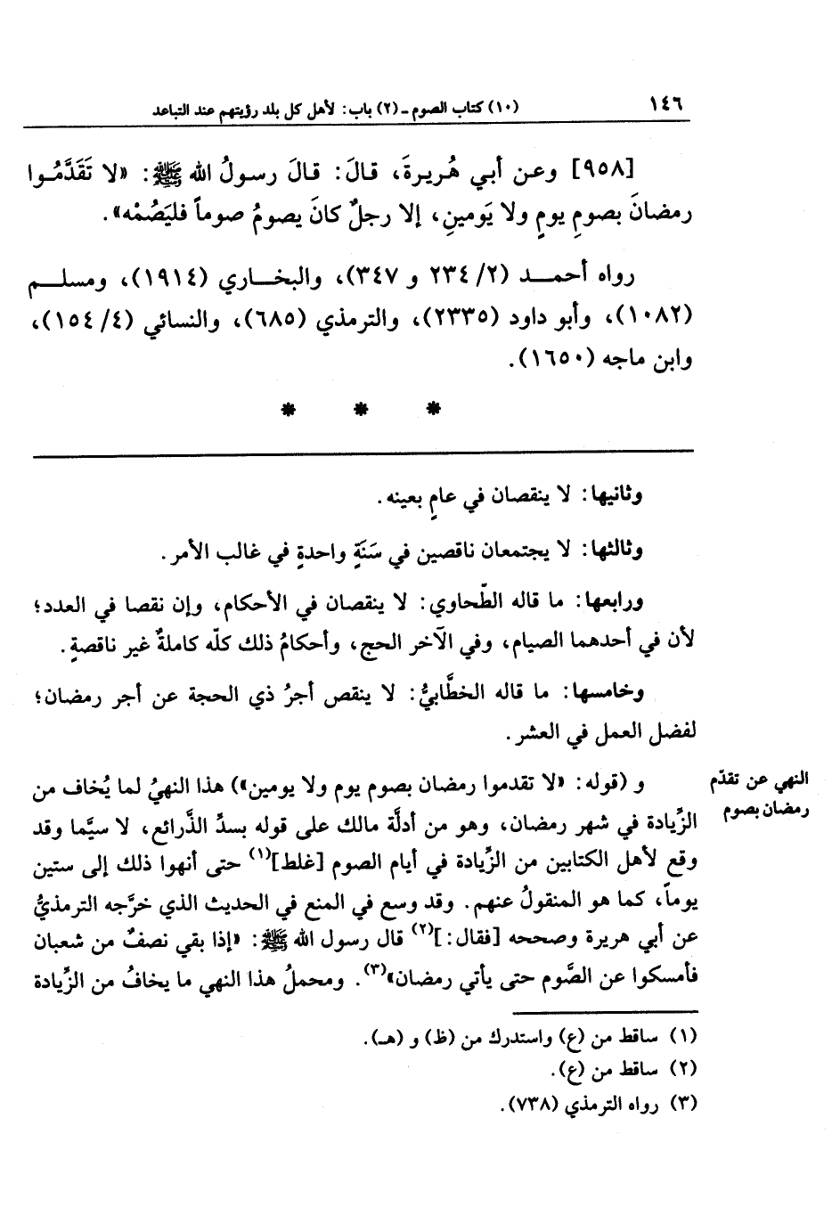 [958] وعَن أَبِي هُرَيرَةَ قَالَ: قَالَ رَسُولُ اللَّهِ -صَلَّى اللَّهُ عَلَيهِ وَسَلَّمَ-: لَا تَقَدَّمُوا رَمَضَانَ بِصَومِ يَومٍ وَلَا يَومَينِ، إِلَّا رَجُلٌ كَانَ يَصُومُ صَومًا فَليَصُمهُ.