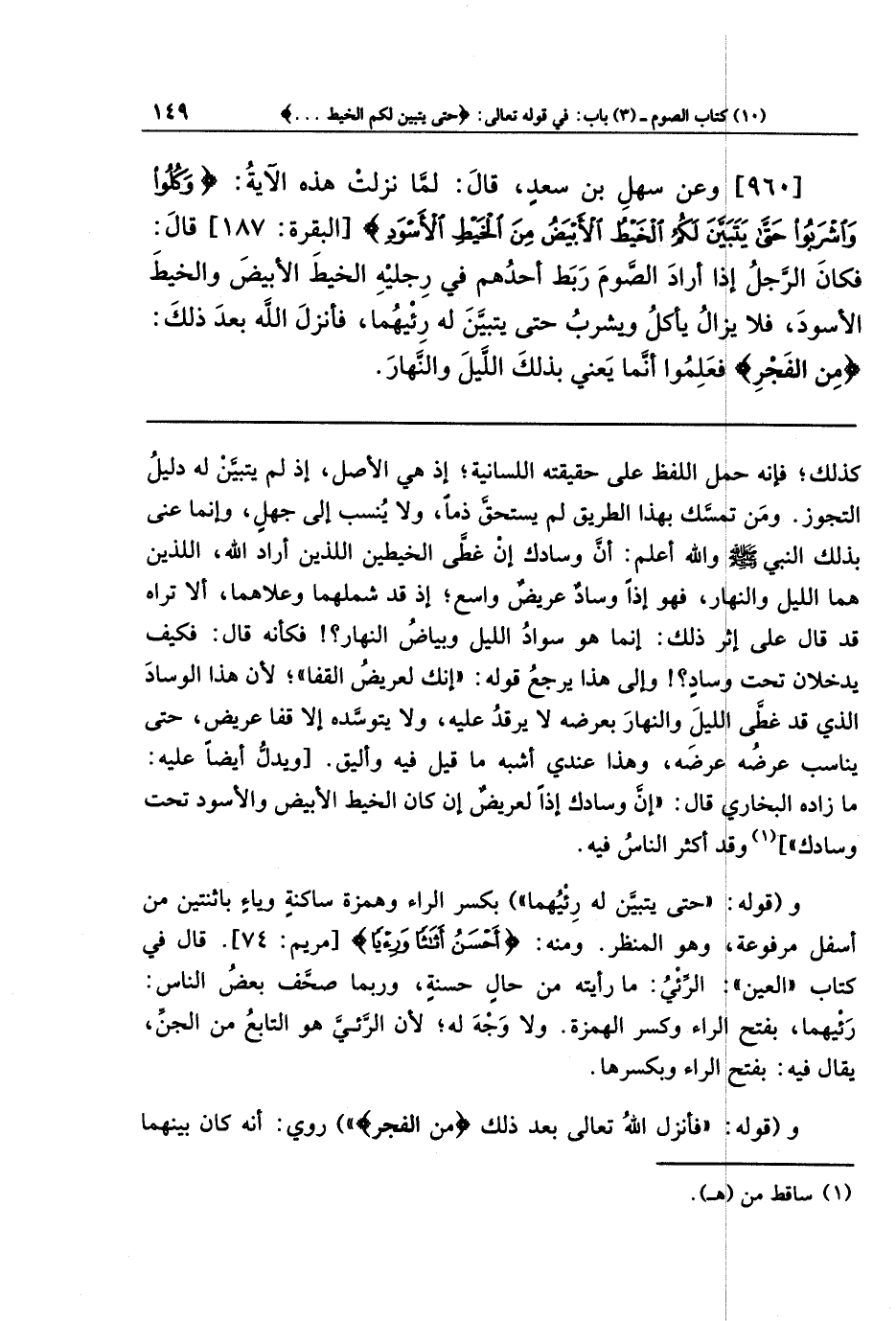 [960] وَعَن سَهلِ بنِ سَعدٍ قَالَ: لَمَّا نَزَلَت هَذِهِ الآيَةُ: {وَكُلُوا وَاشرَبُوا حَتَّى يَتَبَيَّنَ لَكُمُ الخَيطُ الأَبيَضُ مِنَ الخَيطِ الأَسوَدِ} قَالَ: فَكَانَ الرَّجُلُ إِذَا أَرَادَ الصَّومَ رَبَطَ أَحَدُهُم فِي رِجلَيهِ الخَيطَ الأَبيَضَ والخَيطَ الأَسوَدَ، فَلَا يَزَالُ يَأكُلُ وَيَشرَبُ حَتَّى يَتَبَيَّنَ لَهُ رِئيُهُمَا، فَأَنزَلَ اللَّهُ بَعدَ ذَلِكَ: {مِنَ الفَجرِ} فَعَلِمُوا أَنَّمَا يَعنِي بِذَلِكَ اللَّيلَ وَالنَّهَارَ.