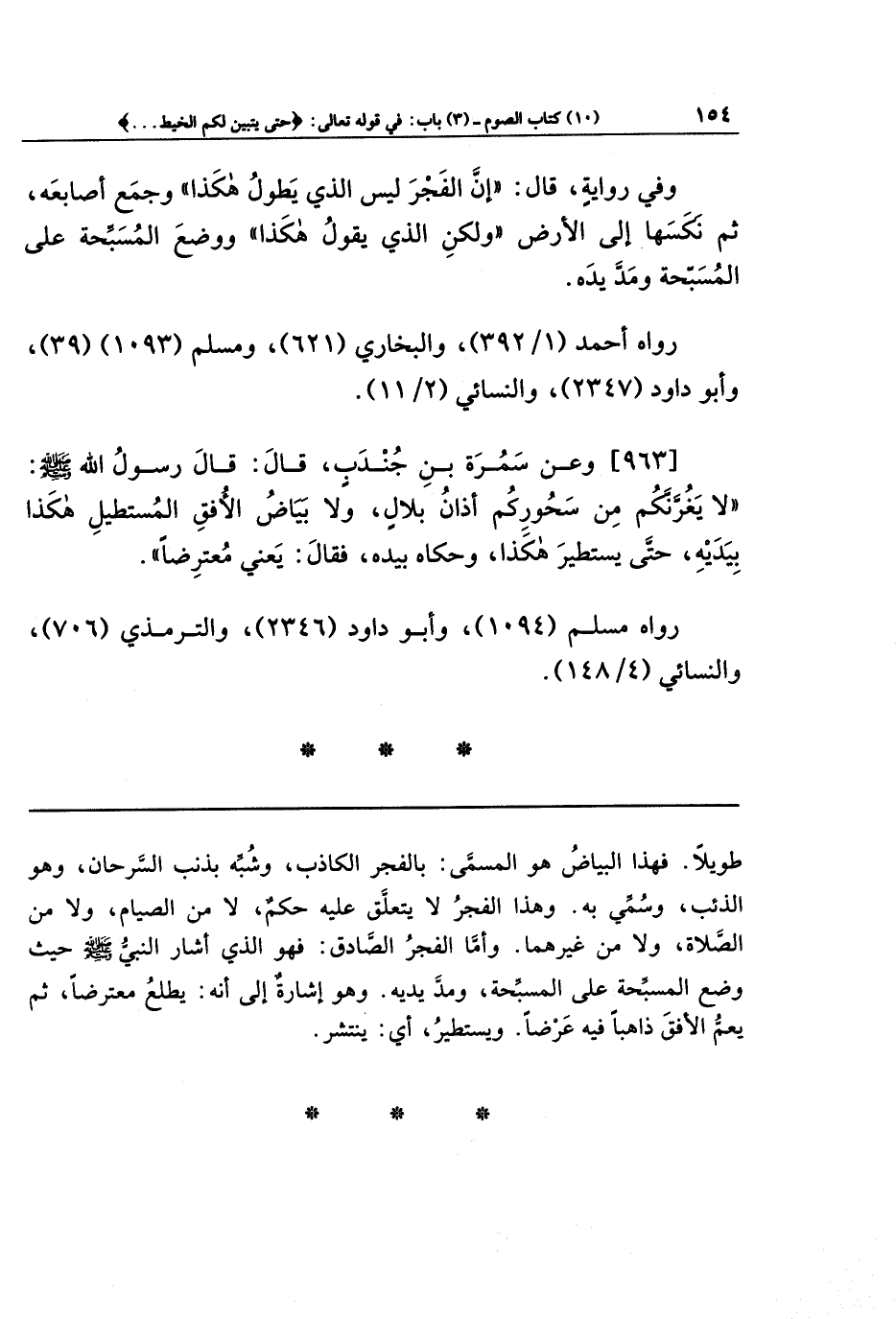 [963] وعَن سَمُرَةَ بنِ جُندُبٍ قَالَ: قَالَ رَسُولُ اللَّهِ -صَلَّى اللَّهُ عَلَيهِ وَسَلَّمَ-: لَا يَغُرَّنَّكُم مِن سَحُورِكُم أَذَانُ بِلَالٍ، وَلَا بَيَاضُ الأُفُقِ المُستَطِيلُ هَكَذَا بيديه، حَتَّى يَستَطِيرَ هَكَذَا، وَحَكَاهُ بِيَدَهِ، فقَالَ: يَعنِي مُعتَرِضًا.