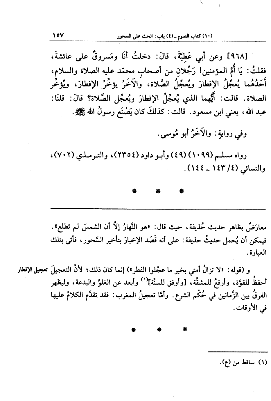 [968] وعَن أَبِي عَطِيَّةَ قَالَ: دَخَلتُ أَنَا وَمَسرُوقٌ عَلَى عَائِشَةَ فَقُلت: يَا أُمَّ المُؤمِنِينَ! رَجُلَانِ مِن أَصحَابِ مُحَمَّدٍ عَلَيهِ الصلاة والسلام: أَحَدُهُمَا يُعَجِّلُ الإِفطَارَ، وَيُعَجِّلُ الصَّلَاةَ، وَالآخَرُ يُؤَخِّرُ الإِفطَارَ وَيُؤَخِّرُ الصَّلَاةَ قَالَت: أَيُّهُمَا الَّذِي يُعَجِّلُ الإِفطَارَ وَيُعَجِّلُ الصَّلَاةَ؟ قَالَ: قُلنَا: عَبدُ اللَّهِ (يَعنِي ابنَ مَسعُودٍ) قَالَت: كَذَلِكَ كَانَ يَصنَعُ رَسُولُ اللَّهِ -صَلَّى اللَّهُ عَلَيهِ وَسَلَّمَ-.