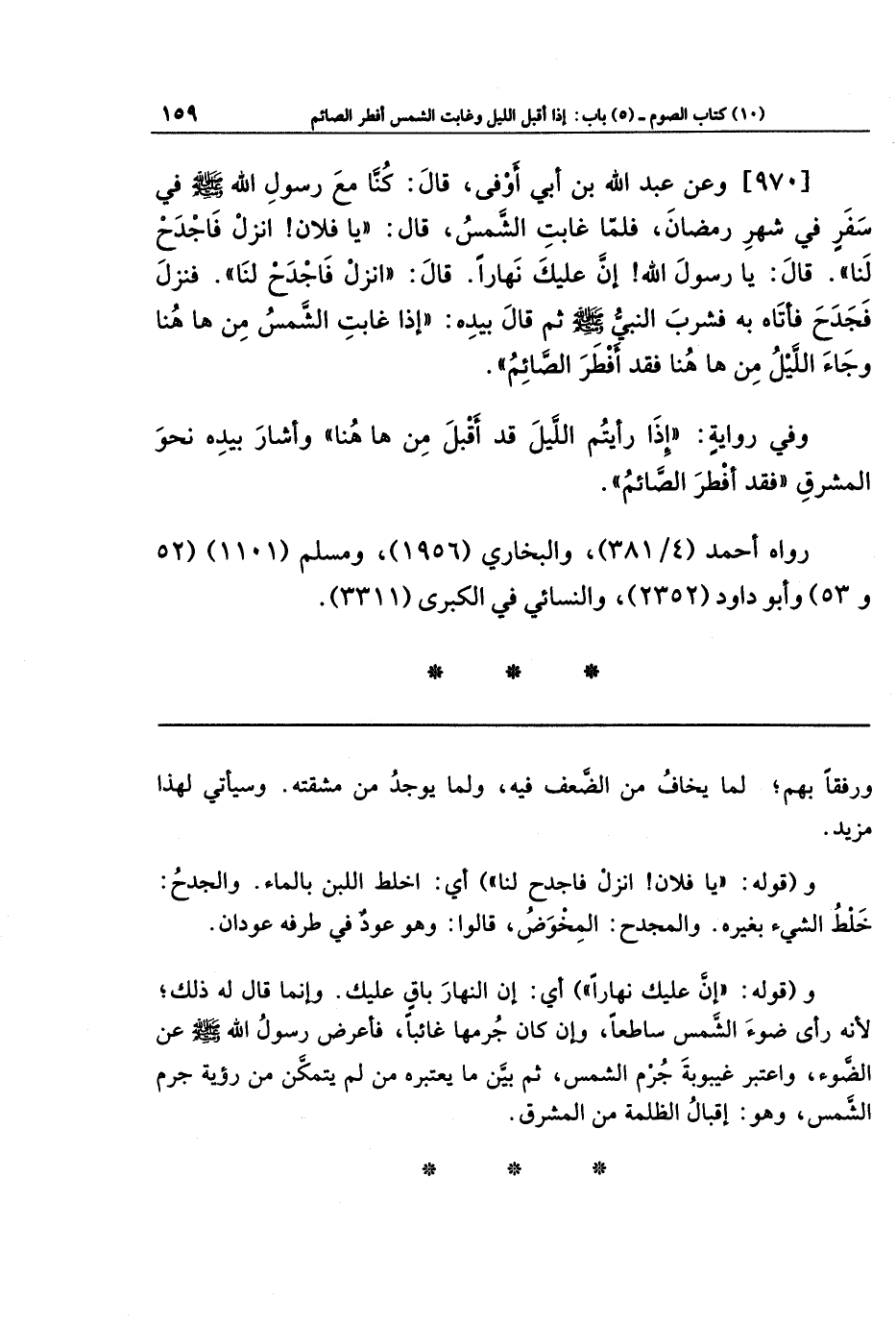 [970] وَعَن عَبدِ اللَّهِ بنِ أَبِي أَوفَى، قَالَ: كُنَّا مَعَ رَسُولِ اللَّهِ -صَلَّى اللَّهُ عَلَيهِ وَسَلَّمَ- فِي سَفَرٍ فِي شَهرِ رَمَضَانَ، فَلَمَّا غَابَت الشَّمسُ قَالَ: يَا فُلَانُ! انزِل فَاجدَح لَنَا قَالَ: يَا رَسُولَ اللَّهِ! إِنَّ عَلَيكَ نَهَارًا، قَالَ: انزِل فَاجدَح لَنَا، فَنَزَلَ فَجَدَحَ فَأَتَاهُ بِهِ، فَشَرِبَ النَّبِيُّ -صَلَّى اللَّهُ عَلَيهِ وَسَلَّمَ-، ثُمَّ قَالَ بِيَدِهِ: إِذَا غَابَت الشَّمسُ مِن هَاهُنَا وَجَاءَ اللَّيلُ مِن هَاهُنَا فَقَد أَفطَرَ الصَّائِمُ.