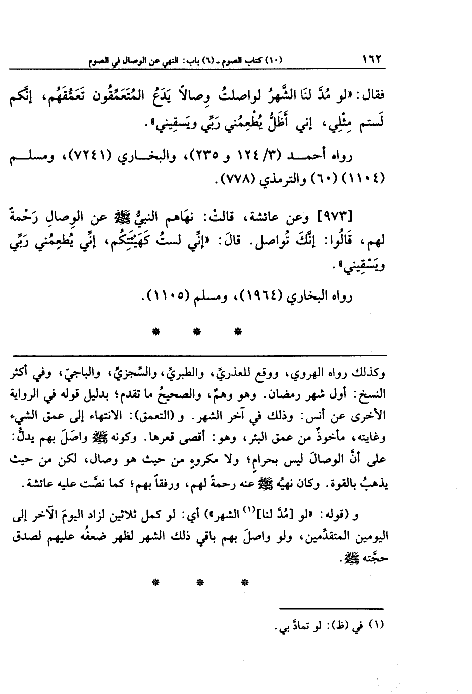 فَقَالَ: لَو مُدَّ لَنَا الشَّهرُ لَوَاصَلت وِصَالاً يَدَعُ المُتَعَمِّقُونَ تَعَمُّقَهُم، إِنَّكُم لَستُم مِثلِي، إِنِّي أَظَلُّ يُطعِمُنِي رَبِّي وَيَسقِينِي.
