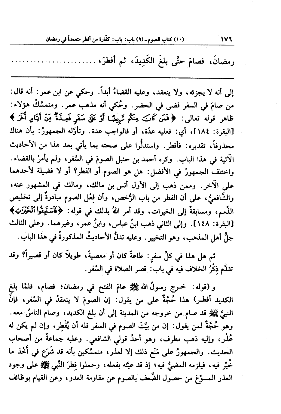 والجمهور على منع ذلك إلا لعذر، متمسكين بأنه قد شرع في أَخذِ ما خير فيه؛ فيلزمه المُضي فيه؛ إذ قد عَيَّنه بفعله، وحملوا فِطر النبي - صلى الله عليه وسلم - على وجود العذر المسوِّغ من حصول الضعف بالصوم عن مقاومة العدو، وعن القيام بوظائف