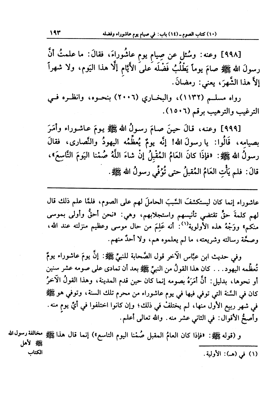 [999] وعنه، قال حِينَ صَامَ رَسُولُ اللَّهِ -صَلَّى اللَّهُ عَلَيهِ وَسَلَّمَ- يَومَ عَاشُورَاءَ وَأَمَرَ بِصِيَامِهِ، قَالُوا: يَا رَسُولَ اللَّهِ! إِنَّهُ يَومٌ يُعَظِّمُهُ اليَهُودُ وَالنَّصَارَى، فَقَالَ رَسُولُ اللَّهِ -صَلَّى اللَّهُ عَلَيهِ وَسَلَّمَ-: فَإِذَا كَانَ العَامُ المُقبِلُ إِن شَاءَ اللَّهُ صُمنَا اليَومَ التَّاسِعَ، قَالَ: فَلَم يَأتِ العَامُ المُقبِلُ حَتَّى تُوُفِّيَ رَسُولُ اللَّهِ -صَلَّى اللَّهُ عَلَيهِ وَسَلَّمَ-.