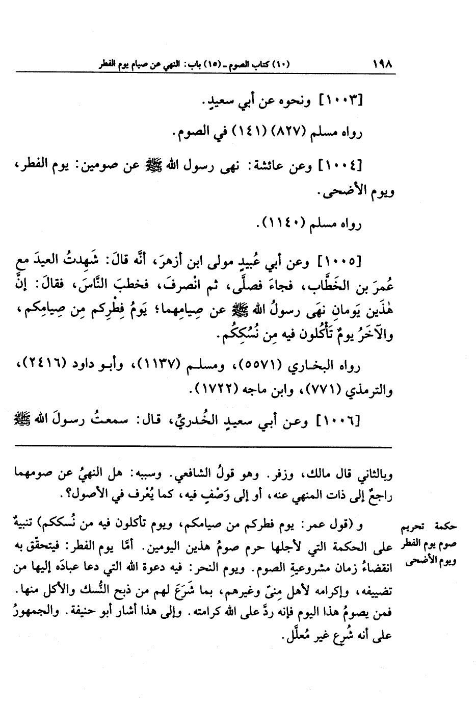 [1005] وعَن أَبِي عُبَيدٍ مَولَى ابنِ أَزهَرَ، أَنَّهُ قَالَ: شَهِدتُ العِيدَ مَعَ عُمَرَ بنِ الخَطَّابِ، فَجَاءَ فَصَلَّى، ثُمَّ انصَرَفَ فَخَطَبَ النَّاسَ فَقَالَ: إِنَّ هَذَينِ يَومَانِ نَهَى رَسُولُ اللَّهِ -صَلَّى اللَّهُ عَلَيهِ وَسَلَّمَ- عَن صِيَامِهِمَا؛ يَومُ فِطرِكُم مِن صِيَامِكُم وَالآخَرُ يَومٌ تَأكُلُونَ فِيهِ مِن نُسُكِكُم.