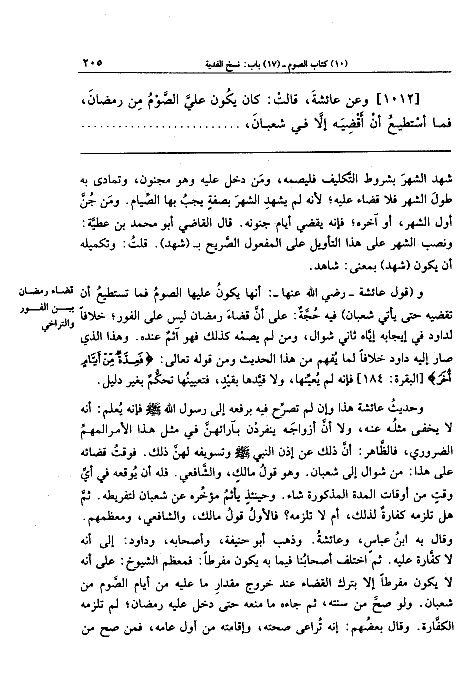 [1012] وعن عَائِشَةَ قالت: كَانَ يَكُونُ عَلَيَّ الصَّومُ مِن رَمَضَانَ فَمَا أَستَطِيعُ أَن أَقضِيَهُ إِلَّا فِي شَعبَانَ
