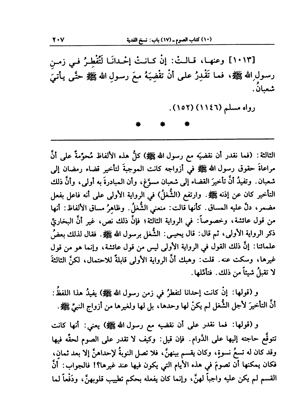 الثالثة: (فما نقدر أن نقضيه مع رسول الله صلى الله عليه وسلم)؛ كل هذه الألفاظ محوِّمَةٌ على أن مراعاة حقوق رسول الله - صلى الله عليه وسلم - في أزواجه كانت الموجبة لتأخير قضاء رمضان إلى شعبان.