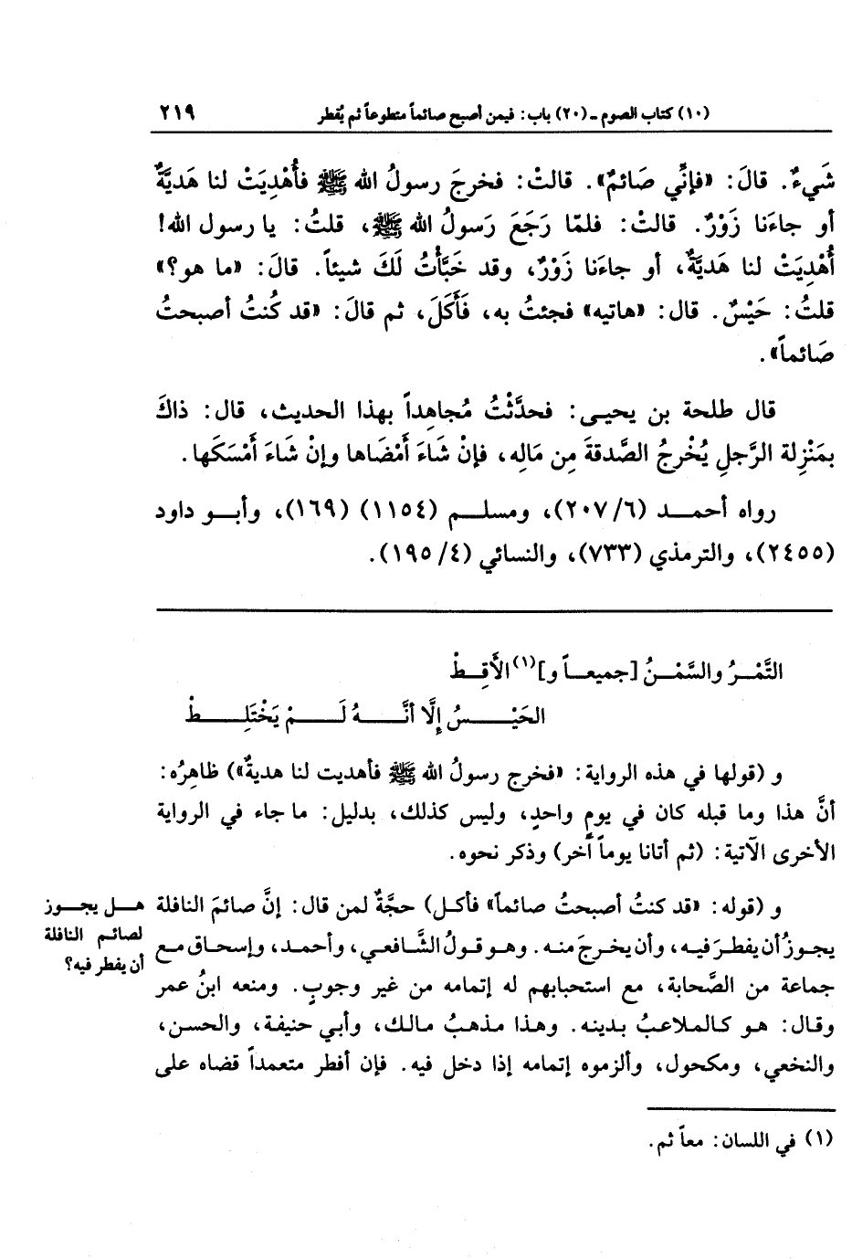قَالَت: فَلَمَّا رَجَعَ رَسُولُ اللَّهِ - صَلَّى اللَّهُ عَلَيهِ وَسَلَّمَ- قُلتُ: يَا رَسُولَ اللَّهِ! أُهدِيَت لَنَا هَدِيَّةٌ، أَو جَاءَنَا زَورٌ، وَقَد خَبَأتُ لك شَيئًا. قَالَ: مَا هُوَ؟ قُلتُ: حَيسٌ قَالَ: هَاتِيهِ فَجِئتُ بِهِ، فَأَكَلَ، ثُمَّ قَالَ: قَد كُنتُ أَصبَحتُ صَائِمًا.