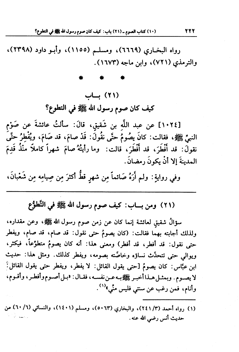 [1024] عن عَبدِ اللَّهِ بنِ شَقِيقٍ قَالَ: سَأَلتُ عَائِشَةَ عَن صَومِ النَّبِيِّ - صَلَّى اللَّهُ عَلَيهِ وَسَلَّمَ- فَقَالَت: كَانَ يَصُومُ حَتَّى نَقُولَ: قَد صَامَ، قَد صَامَ، وَيُفطِرُ حَتَّى نَقُولَ: قَد أَفطَرَ، قَد أَفطَرَ، قَالَت: وَمَا رَأَيتُهُ صَامَ شَهرًا كَامِلاً مُنذُ قَدِمَ المَدِينَةَ إِلَّا أَن يَكُونَ رَمَضَانَ.