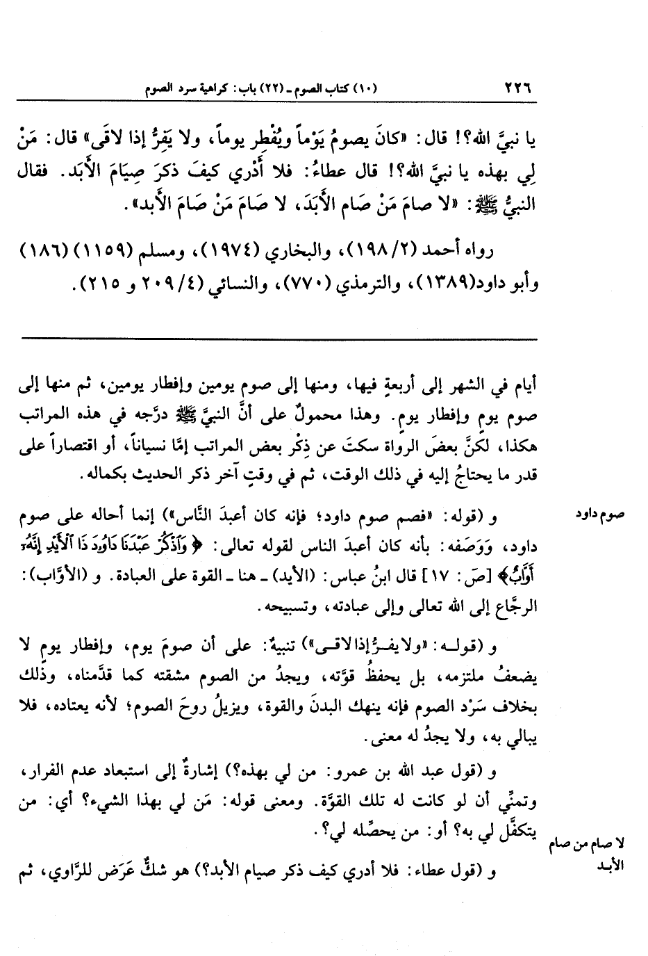 يَا نَبِيَّ اللَّهِ؟ ! قَالَ: كَانَ يَصُومُ يَومًا وَيُفطِرُ يَومًا، وَلَا يَفِرُّ إِذَا لَاقَى. قَالَ: مَن لِي بِهَذِهِ يَا نَبِيَّ اللَّهِ؟ ! قَالَ: عَطَاءٌ: فَلَا أَدرِي كَيفَ ذَكَرَ صِيَامَ الأَبَدِ، فَقَالَ النَّبِيُّ - صَلَّى اللَّهُ عَلَيهِ وَسَلَّمَ-: لَا صَامَ مَن صَامَ الأَبَدَ، لَا صَامَ مَن صَامَ الأَبَدَ.