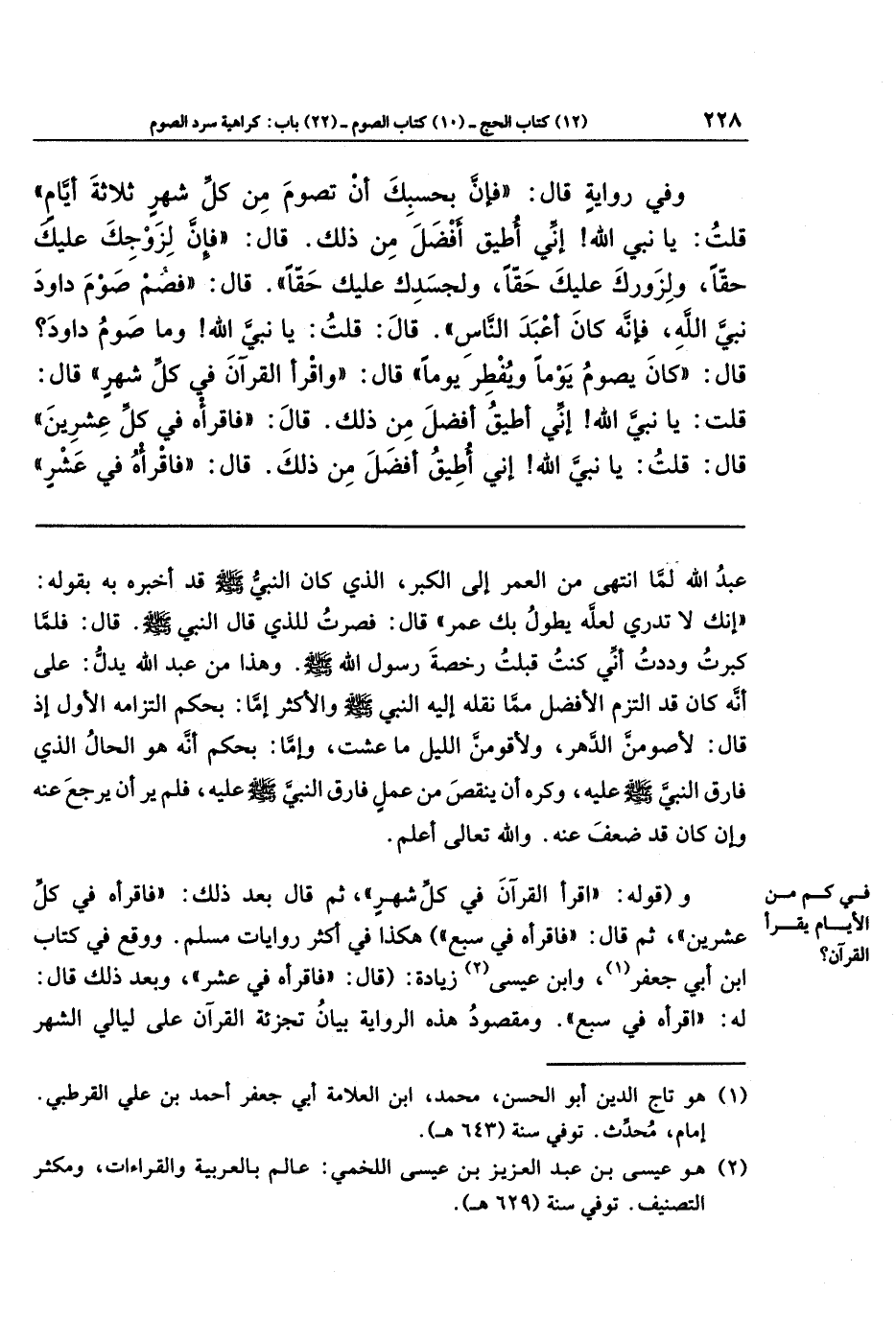 وقوله: (اقرأ القرآن في كل شهر)، ثم قال بعد ذلك: (فاقرأه في كل عشرين)، ثم قال: (فاقرأه في سبع)؛ هكذا في أكثر روايات مسلم. ووقع في كتاب ابن أبي جعفر (¬1)، وابن عيسى (¬2) زيادة: (قال: فاقرأه في عشر)، وبعد ذلك قال له: (اقرأه في سبع). ومقصود هذه الرواية بيان تجزئة القرآن على ليالي الشهر