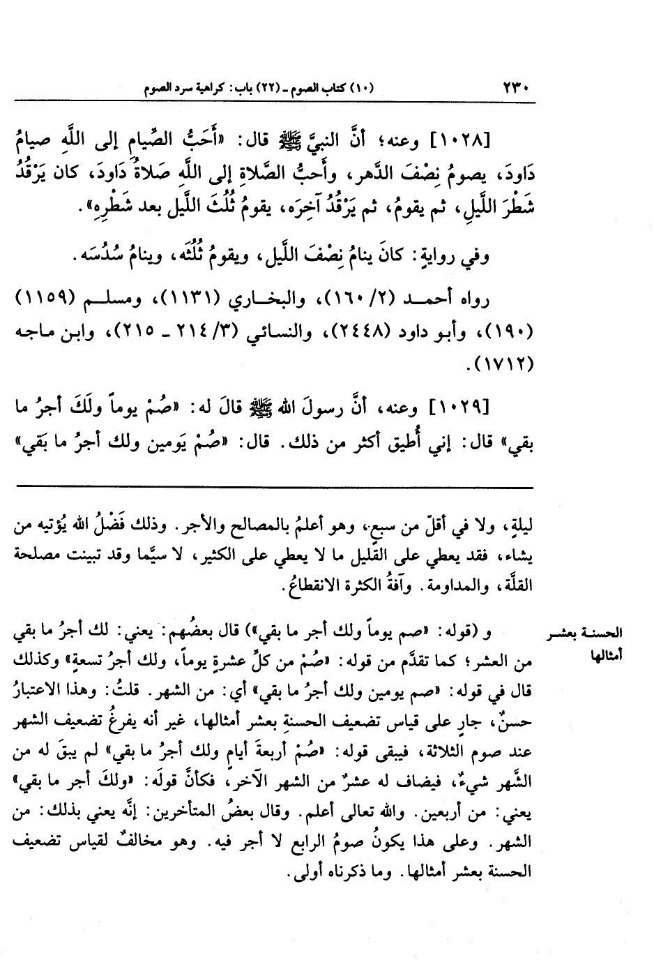 [1028] وعنه أَنَّ النَّبِيَّ - صَلَّى اللَّهُ عَلَيهِ وَسَلَّمَ- قَالَ: أَحَبُّ الصِّيَامِ إِلَى اللَّهِ صِيَامُ دَاوُدَ، يَصُومُ نِصفَ الدَّهرِ، وَأَحَبُّ الصَّلَاةِ إِلَى اللَّهِ صَلَاةُ دَاوُدَ، كَانَ يَرقُدُ شَطرَ اللَّيلِ، ثُمَّ يَقُومُ، ثُمَّ يَرقُدُ آخِرَهُ، يَقُومُ ثُلُثَ اللَّيلِ بَعدَ شَطرِهِ.