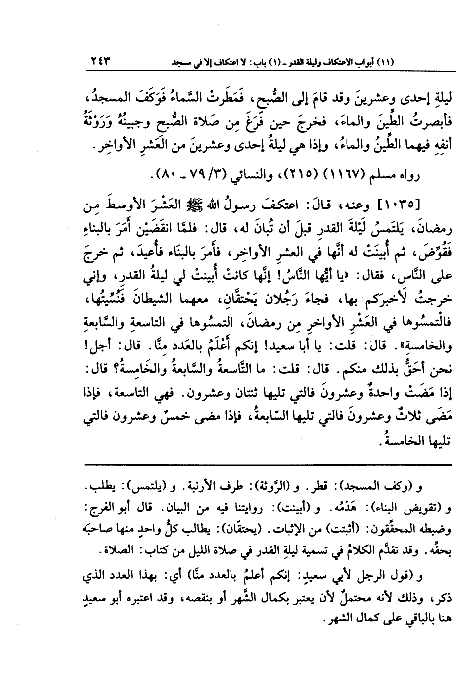 [1035] وعنه قَالَ: اعتَكَفَ رَسُولُ اللَّهِ - صَلَّى اللَّهُ عَلَيهِ وَسَلَّمَ- العَشرَ الأَوسَطَ مِن رَمَضَانَ، يَلتَمِسُ لَيلَةَ القَدرِ قَبلَ أَن تُبَانَ لَهُ، قال: فَلَمَّا انقَضَينَ أَمَرَ بِالبِنَاءِ فَقُوِّضَ، ثُمَّ أُبِينَت لَهُ أَنَّهَا فِي العَشرِ الأَوَاخِرِ، فَأَمَرَ بِالبِنَاءِ فَأُعِيدَ، ثُمَّ خَرَجَ عَلَى النَّاسِ فَقَالَ: يَا أَيُّهَا النَّاسُ إِنَّهَا كَانَت أُبِينَت لِي لَيلَةُ القَدرِ، وَإِنِّي خَرَجتُ لِأُخبِرَكُم بِهَا، فَجَاءَ رَجُلَانِ يَحتَقَّانِ، مَعَهُمَا الشَّيطَانُ فَنُسِّيتُهَا، فَالتَمِسُوهَا فِي العَشرِ الأَوَاخِرِ مِن رَمَضَانَ التَمِسُوهَا فِي التَّاسِعَةِ وَالسَّابِعَةِ وَالخَامِسَةِ قَالَ: قُلتُ: يَا أَبَا سَعِيدٍ إِنَّكُم أَعلَمُ بِالعَدَدِ مِنَّا قَالَ: أَجَل نَحنُ أَحَقُّ بِذَلِكَ مِنكُم، قَالَ: قُلتُ: مَا التَّاسِعَةُ وَالسَّابِعَةُ وَالخَامِسَةُ؟ قَالَ: إِذَا مَضَت وَاحِدَةٌ وَعِشرُونَ فَالَّتِي تَلِيهَا ثِنتَانِ وَعِشرِونَ فَهِيَ التَّاسِعَةُ، فَإِذَا مَضَت ثَلَاثٌ وَعِشرُونَ، فَالَّتِي تَلِيهَا السَّابِعَةُ، فَإِذَا مَضَى خَمسٌ وَعِشرُونَ فَالَّتِي تَلِيهَا الخَامِسَةُ.