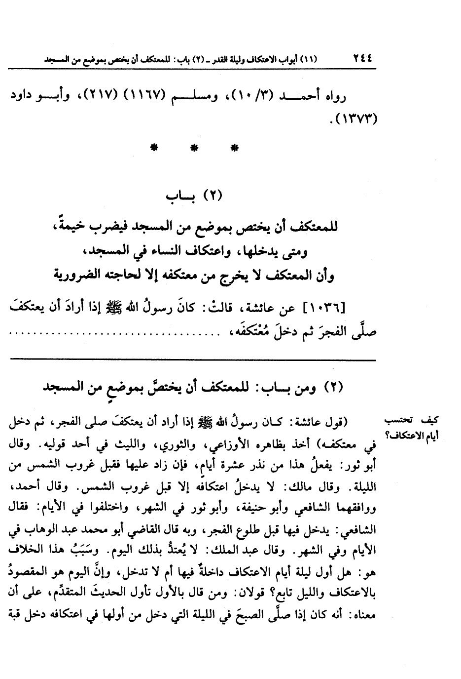 (2) باب للمعتكف أن يختص بموضع من المسجد فيضرب خيمة ومتى يدخلها، واعتكاف النساء في المسجد وأن المعتكف لا يخرج من معتكفه إلا لحاجته الضرورية