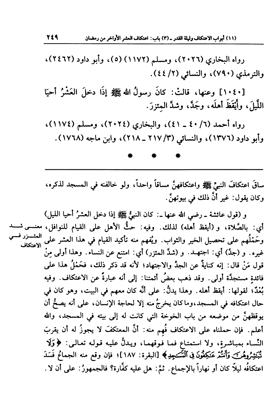 وقد ذهب بعض أئمتنا: إلى أنه عبارة عن الاعتكاف. وفيه بُعد؛ لقولها: أيقظ أهله. وهذا يدل على أنه كان معهم في البيت، وهو كان في حال اعتكافه في المسجد، وما كان يخرج منه إلا لحاجة الإنسان، على أنه يصح أن يوقظهن من موضعه من باب الخوخة التي كانت له إلى بيته في المسجد، والله أعلم.