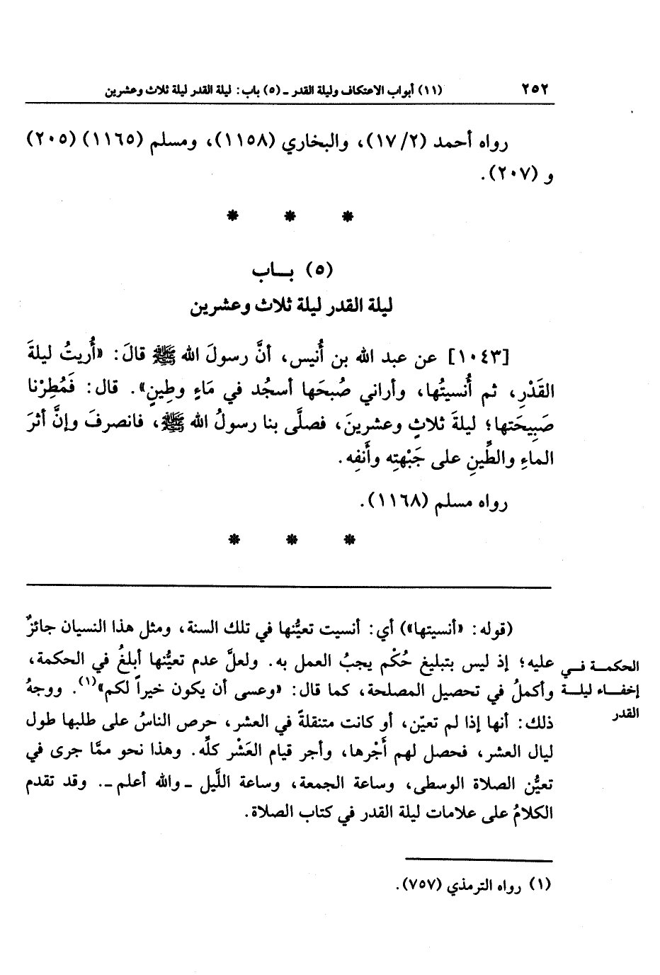 [1043] عَن عَبدِ اللَّهِ بنِ أُنَيسٍ أَنَّ رَسُولَ اللَّهِ - صَلَّى اللَّهُ عَلَيهِ وَسَلَّمَ- قَالَ: أُرِيتُ لَيلَةَ القَدرِ، ثُمَّ أُنسِيتُهَا وَأَرَانِي صُبحَهَا أَسجُدُ فِي مَاءٍ وَطِينٍ قَالَ: فَمُطِرنَا صبيحتها لَيلَةَ ثَلَاثٍ وَعِشرِينَ، فَصَلَّى بِنَا رَسُولُ اللَّهِ - صَلَّى اللَّهُ عَلَيهِ وَسَلَّمَ-، فَانصَرَفَ وَإِنَّ أَثَرَ المَاءِ وَالطِّينِ عَلَى جَبهَتِهِ وَأَنفِهِ.
