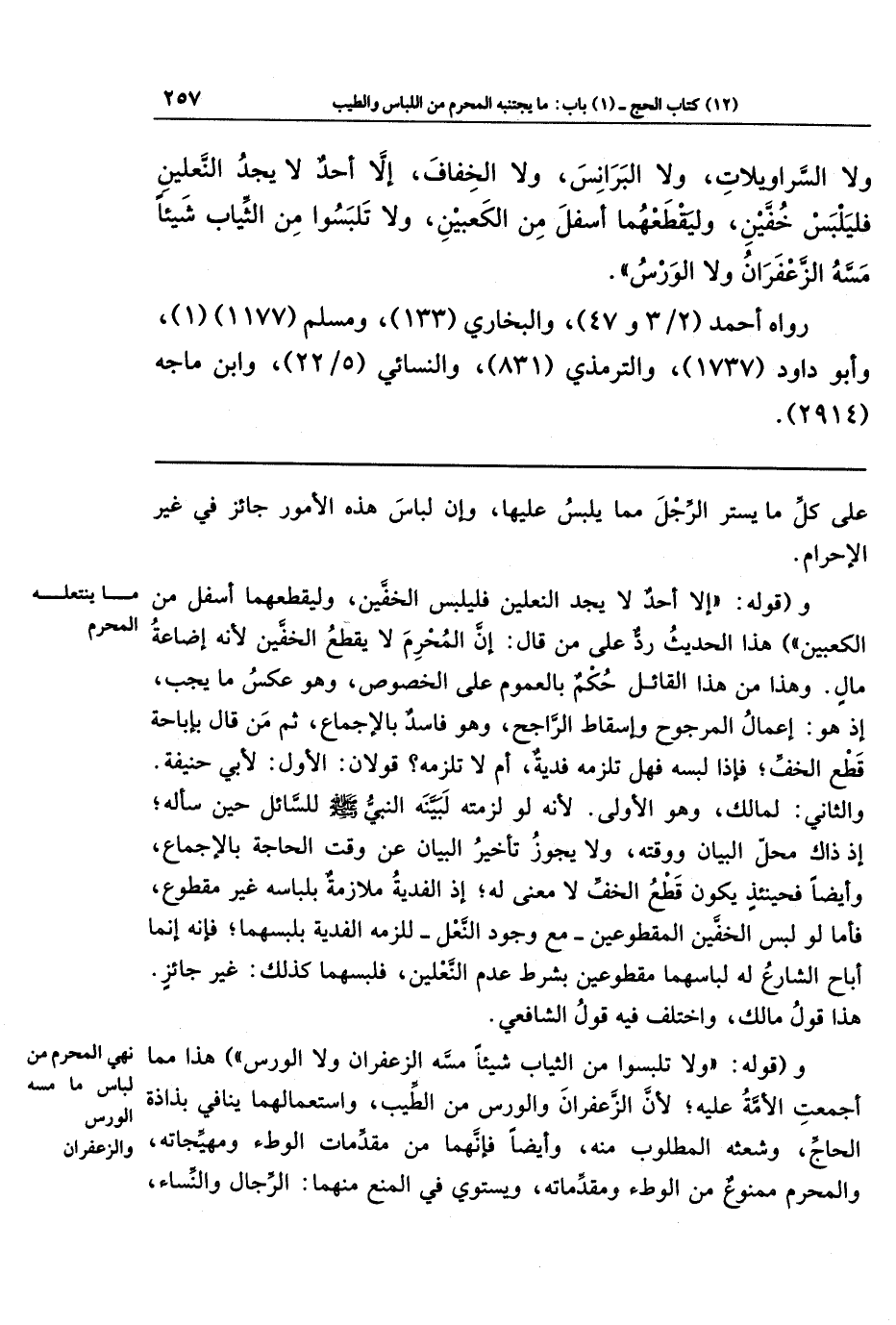 وَلَا السَّرَاوِيلَاتِ وَلَا البَرَانِسَ، وَلَا الخِفَافَ، إِلَّا أَحَدٌ لَا يَجِدُ النَّعلَينِ فَليَلبَس خُفَّينِ، وَليَقطَعهُمَا أَسفَلَ مِن الكَعبَينِ، وَلَا تَلبَسُوا مِن الثِّيَابِ شَيئًا مَسَّهُ الزَّعفَرَانُ، وَلَا الوَرسُ.