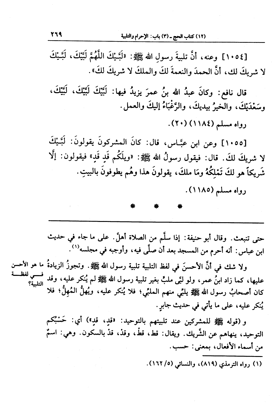 [1055] وَعَن ابنِ عَبَّاسٍ، قَالَ: كَانَ المُشرِكُونَ يَقُولُونَ: لَبَّيكَ لَا شَرِيكَ لك. قَالَ: فَيَقُولُ رَسُولُ اللَّهِ - صَلَّى اللَّهُ عَلَيهِ وَسَلَّمَ- وَيلَكُم قَد قَد، فَيَقُولُونَ: إِلَّا شَرِيكًا هُوَ لك تَملِكُهُ وَمَا مَلَكَ، يَقُولُونَ: هَذَا وَهُم يَطُوفُونَ بِالبَيتِ.