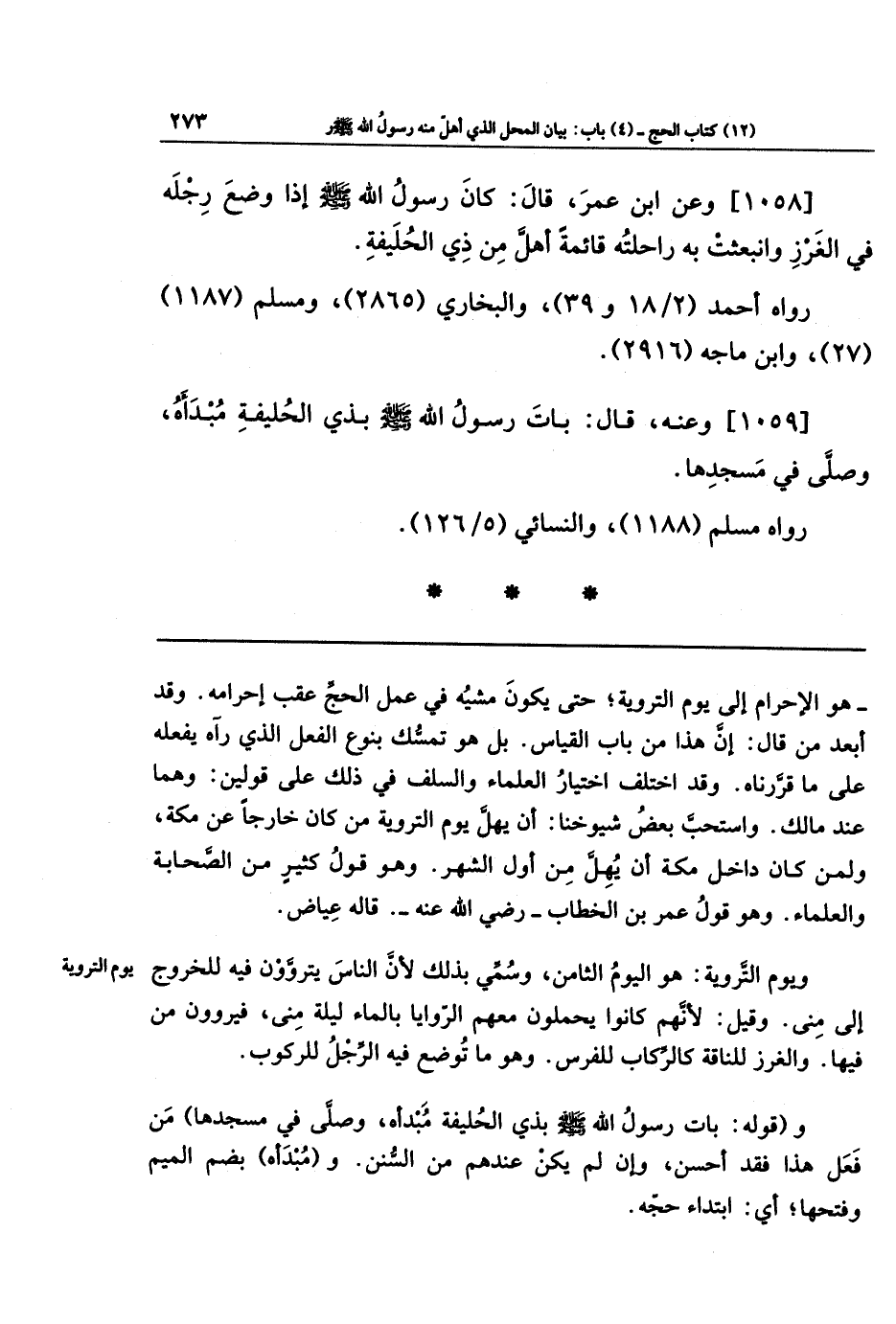 [1058] وعَن ابنِ عُمَرَ قَالَ: كَانَ رَسُولُ اللَّهِ - صَلَّى اللَّهُ عَلَيهِ وَسَلَّمَ- إِذَا وَضَعَ رِجلَهُ فِي الغَرزِ، وَانبَعَثَت بِهِ رَاحِلَتُهُ قَائِمَةً أَهَلَّ مِن ذِي الحُلَيفَةِ.