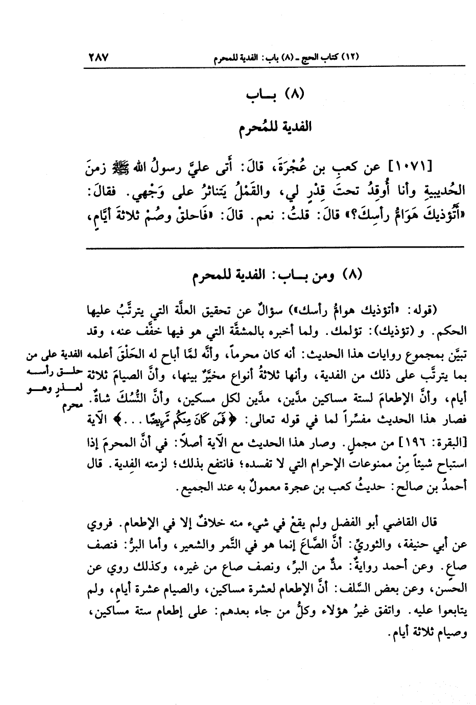 [1071] عَن كَعبِ بنِ عُجرَةَ قَالَ: أَتَى عَلَيَّ رَسُولُ اللَّهِ - صَلَّى اللَّهُ عَلَيهِ وَسَلَّمَ- زَمَنَ الحُدَيبِيَةِ وَأَنَا أُوقِدُ تَحتَ قِدرٍ لِي: وَالقَملُ يَتَنَاثَرُ عَلَى وَجهِي، فَقَالَ: أَتُؤذِيكَ هَوَامُّ رَأسِكَ؟ قَالَ: قُلتُ: نَعَم. قَالَ: فَاحلِق وَصُم ثَلَاثَةَ أَيَّامٍ،
