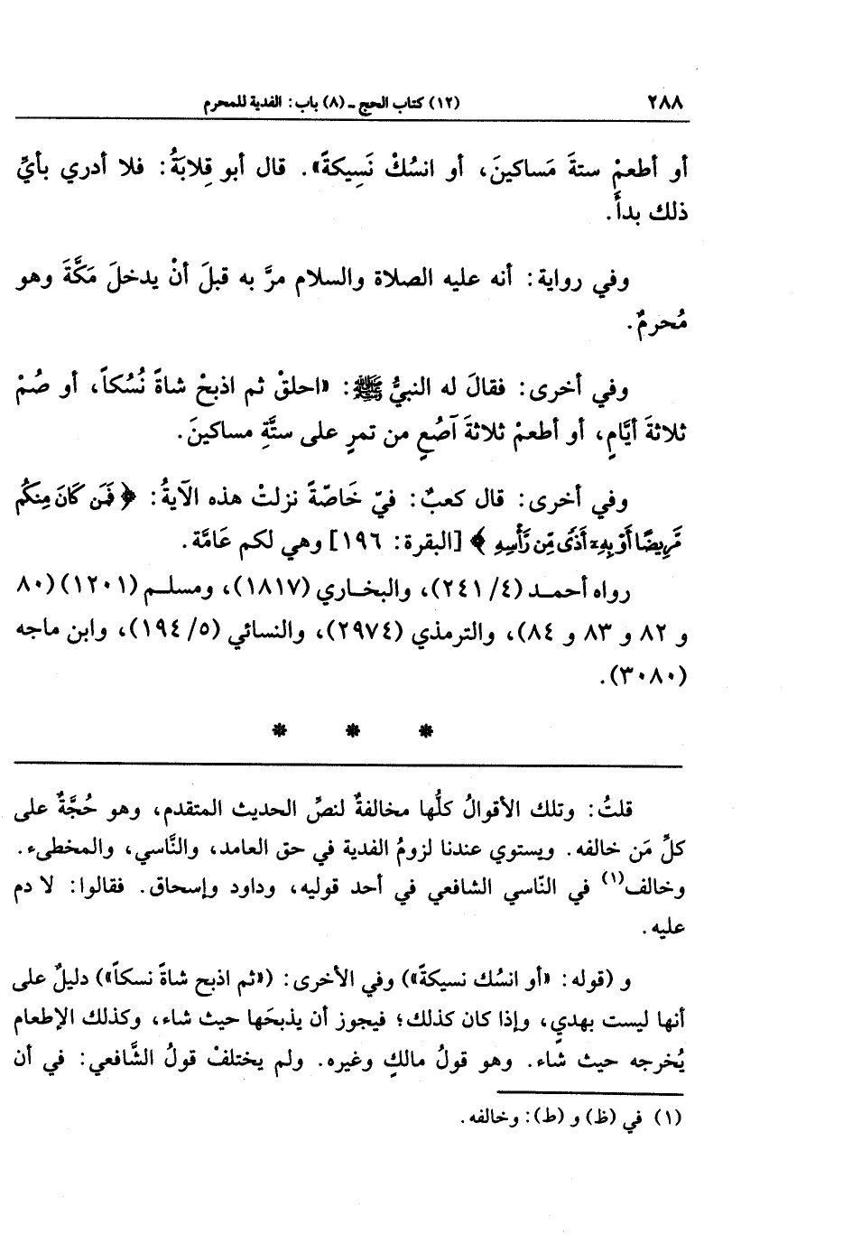 وفي أخرى: فقال له النبي - صلى الله عليه وسلم -: احلِق ثُمَّ اذبَح شَاةً نُسُكًا، أَو صُم ثَلَاثَةَ أَيَّامٍ، أَو أَطعِم ثَلَاثَةَ آصُعٍ مِن تَمرٍ عَلَى سِتَّةِ مَسَاكِينَ.