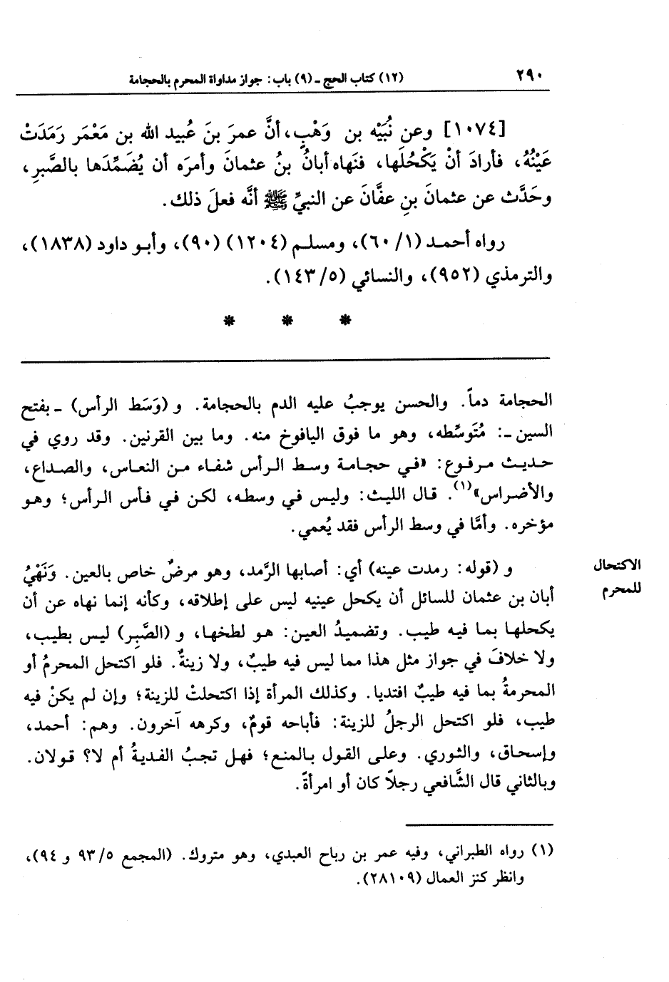 [1074] وعن نُبَيهُ بنُ وَهبٍ، أَنَّ عُمَرَ بنَ عُبَيدِ اللَّهِ بنِ مَعمَرٍ رَمِدَت عَينُهُ، فَأَرَادَ أَن يَكحُلَهَا، فَنَهَاهُ أَبَانُ بنُ عُثمَانَ، وَأَمَرَهُ أَن يُضَمِّدَهَا بِالصَّبِرِ، وَحَدَّثَ عَن عُثمَانَ بنِ عَفَّانَ عَن النَّبِيِّ - صَلَّى اللَّهُ عَلَيهِ وَسَلَّمَ- أَنَّهُ فَعَلَ ذَلِكَ.