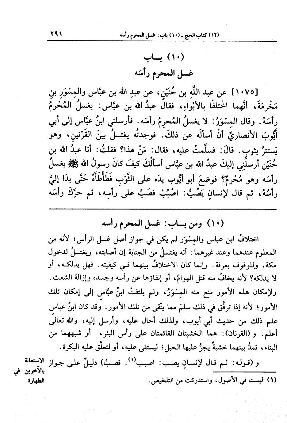 [1075] عَن عَبدِ اللَّهِ بنِ حُنَينٍ، عَن عَبدِ اللَّهِ بنِ عَبَّاسٍ، وَالمِسوَرِ بنِ مَخرَمَةَ، أَنَّهُمَا اختَلَفَا بِالأَبوَاءِ، فَقَالَ عَبدُ اللَّهِ بنُ عَبَّاسٍ: يَغسِلُ المُحرِمُ رَأسَهُ، وَقَالَ المِسوَرُ: لَا يَغسِلُ المُحرِمُ رَأسَهُ. فَأَرسَلَنِي ابنُ عَبَّاسٍ إِلَى أَبِي أَيُّوبَ الأَنصَارِيِّ أن أَسأَلُهُ عَن ذَلِكَ. فَوَجَدتُهُ يَغتَسِلُ بَينَ القَرنَينِ، وَهُوَ يَستَتِرُ بِثَوبٍ. قَالَ: فَسَلَّمتُ عَلَيهِ، فَقَالَ: مَن هَذَا؟ فَقُلتُ: أَنَا عَبدُ اللَّهِ بنُ حُنَينٍ أَرسَلَنِي إِلَيكَ عَبدُ اللَّهِ بنُ عَبَّاسٍ أَسأَلُكَ كَيفَ كَانَ رَسُولُ اللَّهِ - صَلَّى اللَّهُ عَلَيهِ وَسَلَّمَ- يَغسِلُ رَأسَهُ وَهُوَ مُحرِمٌ؟ فَوَضَعَ أَبُو أَيُّوبَ يَدَهُ عَلَى الثَّوبِ فَطَأطَأَهُ حَتَّى بَدَا إلِي رَأسُهُ، ثُمَّ قَالَ: لِإِنسَانٍ يَصُبُّ: اصبُب فَصَبَّ عَلَى رَأسِهِ، ثُمَّ حَرَّكَ رَأسَهُ
