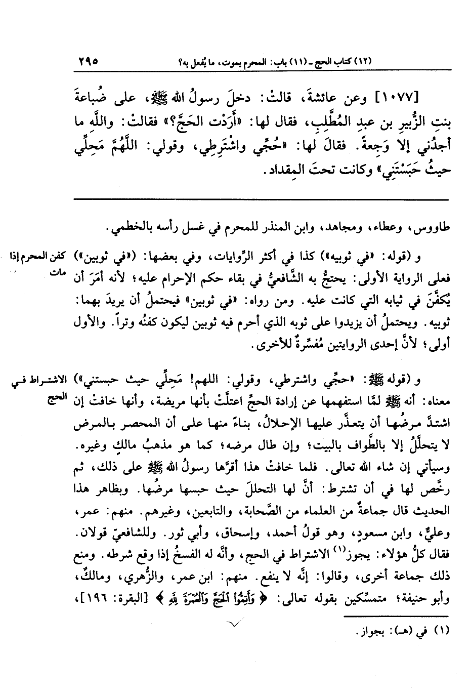 [1077] وَعَن عَائِشَةَ قَالَت: دَخَلَ رَسُولُ اللَّهِ - صَلَّى اللَّهُ عَلَيهِ وَسَلَّمَ- عَلَى ضُبَاعَةَ بِنتِ الزُّبَيرِ بن عبد المطلب، فَقَالَ لَهَا: أَرَدتِ الحَجَّ؟ فقَالَت: وَاللَّهِ مَا أَجِدُنِي إِلَّا وَجِعَةً. فَقَالَ لَهَا: حُجِّي وَاشتَرِطِي، وَقُولِي: اللَّهُمَّ مَحِلِّي حيث حَبَستَنِي وَكَانَت تَحتَ المِقدَادِ.