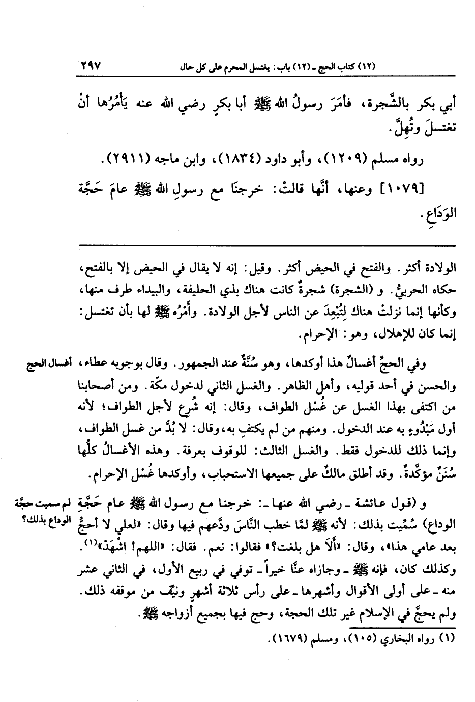 [1079] وَعَنهَا، أَنَّهَا قَالَت: خَرَجنَا مَعَ رَسُولِ اللَّهِ - صَلَّى اللَّهُ عَلَيهِ وَسَلَّمَ- عَامَ حَجَّةِ الوَدَاعِ.
