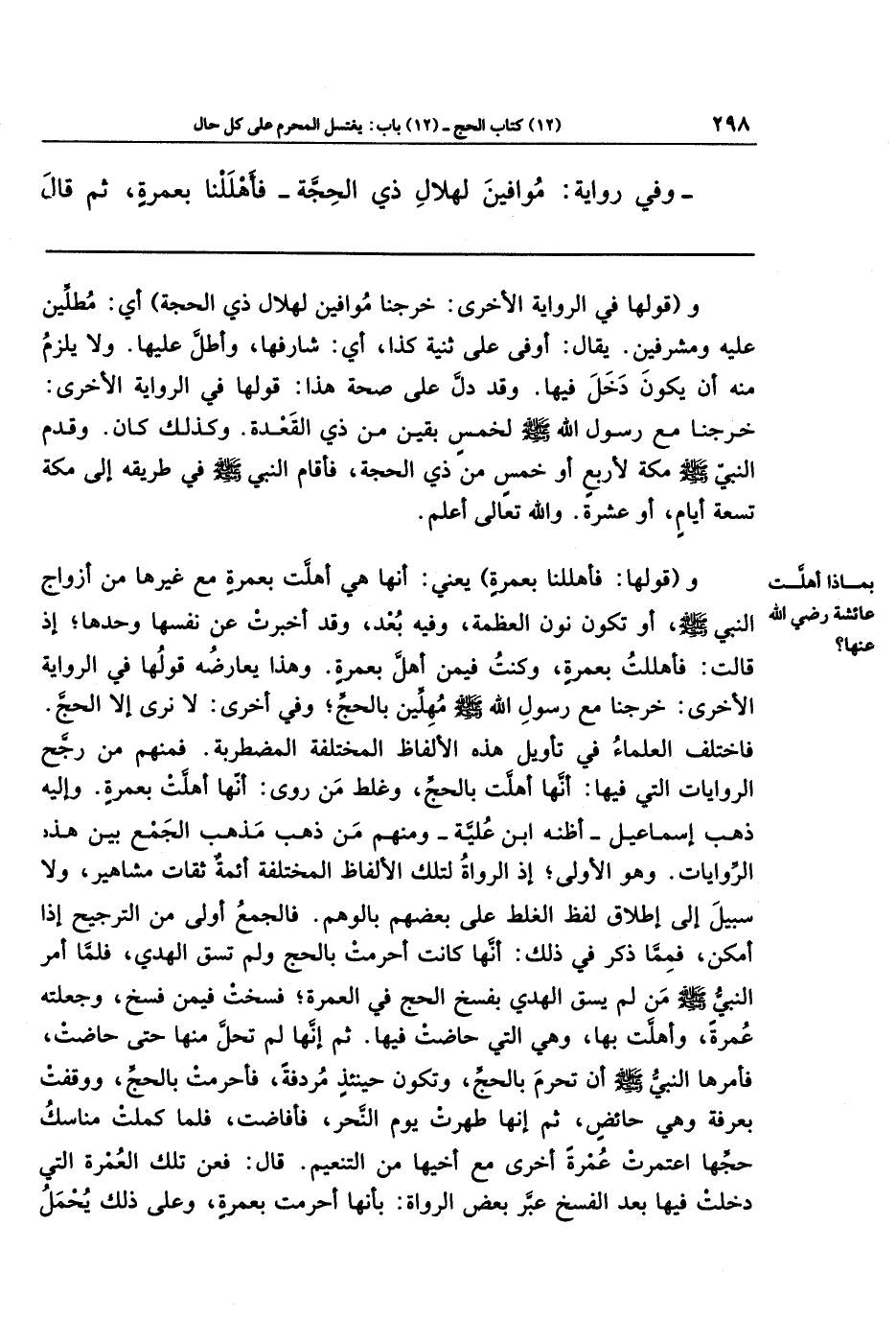 وقولها: (فأهللنا بعمرة)؛ يعني: أنها هي أهلت بعمرة مع غيرها من أزواج النبي - صلى الله عليه وسلم -، أو تكون نون العظمة، وفيه بُعد، وقد أخبرت عن نفسها وحدها؛ إذ قالت: (فأهللت بعمرة)، و (كنت فيمن أهل بعمرة)؛ وهذا يعارضه قولها في الرواية الأخرى: (خرجنا مع رسول الله - صلى الله عليه وسلم - مهلين بالحج)، وفي أخرى: (لا نرى إلا الحج).
