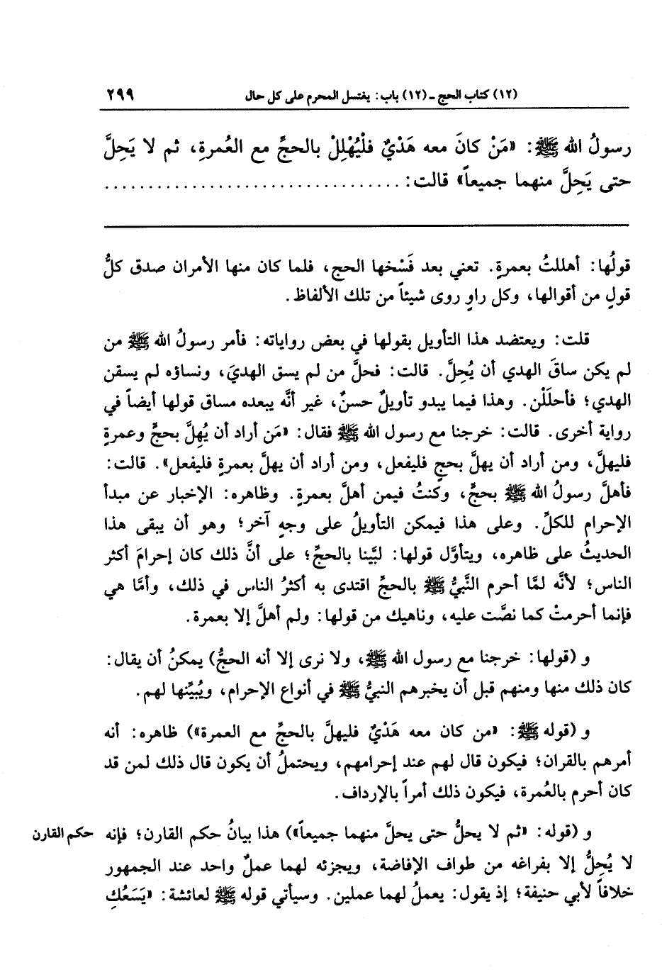 قلت: ويعتضد هذا التأويل بقولها في بعض رواياته: فأمر رسول الله - صلى الله عليه وسلم - من لم يكن ساق الهدي أن يحل، قالت: فحل من لم يسق الهدي، ونساؤه لم يسقن الهدي؛ فأحللن. وهذا فيما يبدو تأويل حسن، غير أنه يبعده مساق قولها أيضًا في رواية أخرى قالت: خرجنا مع رسول الله - صلى الله عليه وسلم - فقال: (من أراد أن يهل بحج وعمرة فليهل، ومن أراد أن يهل بحج فليفعل، ومن أراد أن يهل بعمرة فليفعل)؛ قالت: فأهل رسول الله - صلى الله عليه وسلم - بحج، وكنت فيمن أهل بعمرة. وظاهره: الإخبار عن مبدأ الإحرام للكل. وعلى هذا فيمكن التأويل على وجه آخر؛ وهو أن يبقى هذا الحديث على ظاهره، ويتأوَّل قولها: (لبينا بالحج)؛ على أن ذلك كان إحرام أكثر الناس؛ لأنه لما أحرم النبي - صلى الله عليه وسلم - بالحج اقتدى به أكثر الناس في ذلك، وأما هي فإنما أحرمت كما نصَّت عليه، وناهيك من قولها: (ولم أهل إلا بعمرة).