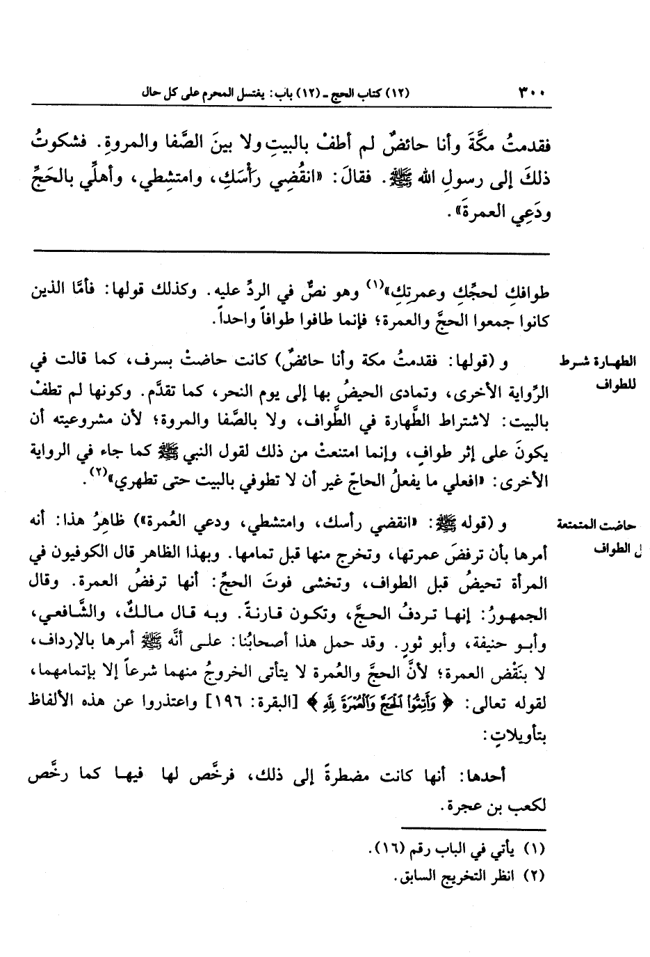 وقولها: (فقدمت مكة وأنا حائض)؛ كانت حاضت بسَرَف، كما قالت في الرواية الأخرى، وتمادى الحيض بها إلى يوم النحر، كما تقدَّم. وكونها لم تطف بالبيت؛ لاشتراط الطهارة في الطواف، ولا بالصفا والمروة؛ لأن مشروعيته أن يكون على إثر طواف، وإنما امتنعت من ذلك لقول النبي - صلى الله عليه وسلم - كما جاء في الرواية الأخرى: (افعلي ما يفعل الحاج غير أن لا تطوفي بالبيت حتى تطهري) (¬2).