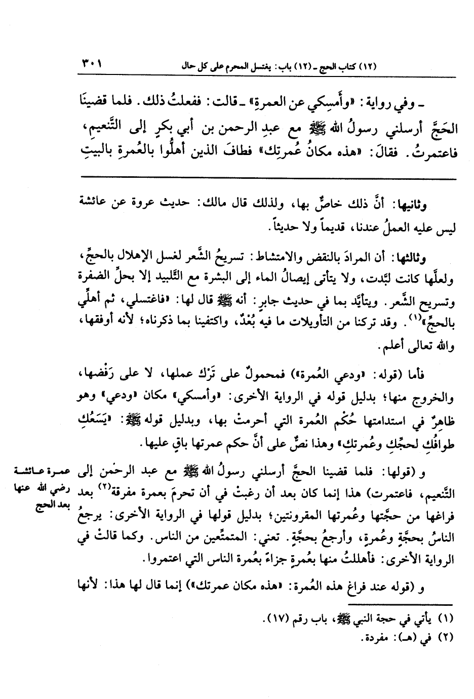 وقولها: (فلما قضينا الحج أرسلني رسول الله - صلى الله عليه وسلم - مع عبد الرحمن إلى التنعيم فاعتمرت)؛ هذا إنما كان بعد أن رغبت في أن تحرم بعمرة مفرقة (¬2) بعد فراغها من حجتها وعمرتها المقرونتين، بدليل قولها في الرواية الأخرى: (يرجع الناس بحجة وعمرة وأرجع بحجة)؛ تعني المتمتعين من الناس، وكما قالت في الرواية الأخرى: (فأهللت منها بعمرة جزاءً بعمرة الناس التي اعتمروا).