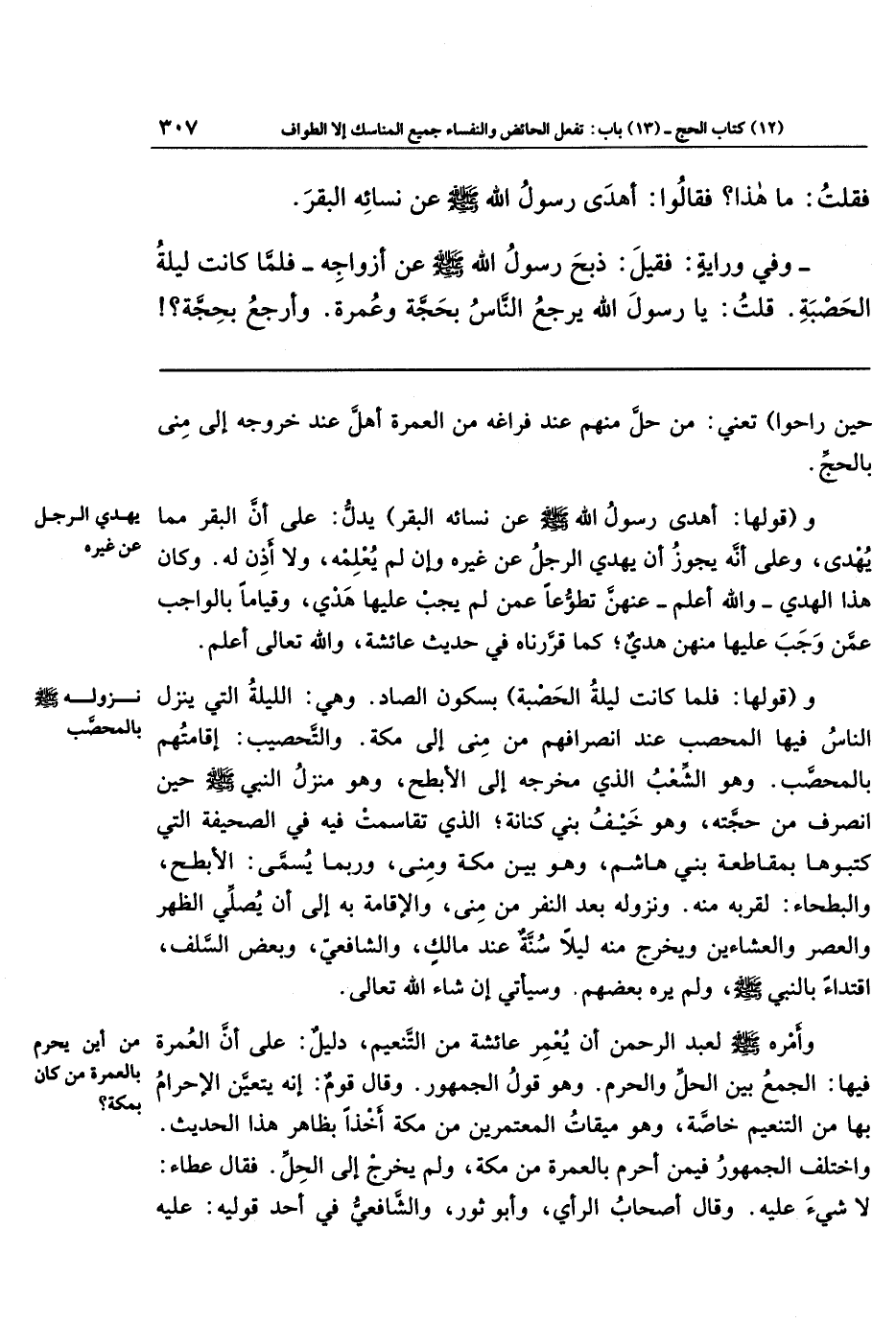 _ وَفِي رِوَايَةٍ: فقيل: ذَبَحَ رَسُولُ اللَّهِ - صَلَّى اللَّهُ عَلَيهِ وَسَلَّمَ- عن أزواجه - فَلَمَّا كَانَت لَيلَةُ الحَصبَةِ قُلتُ: يَا رَسُولَ اللَّهِ! يَرجِعُ النَّاسُ بِحَجَّةٍ وَعُمرَةٍ وَأَرجِعُ بِحَجَّةٍ؟ !