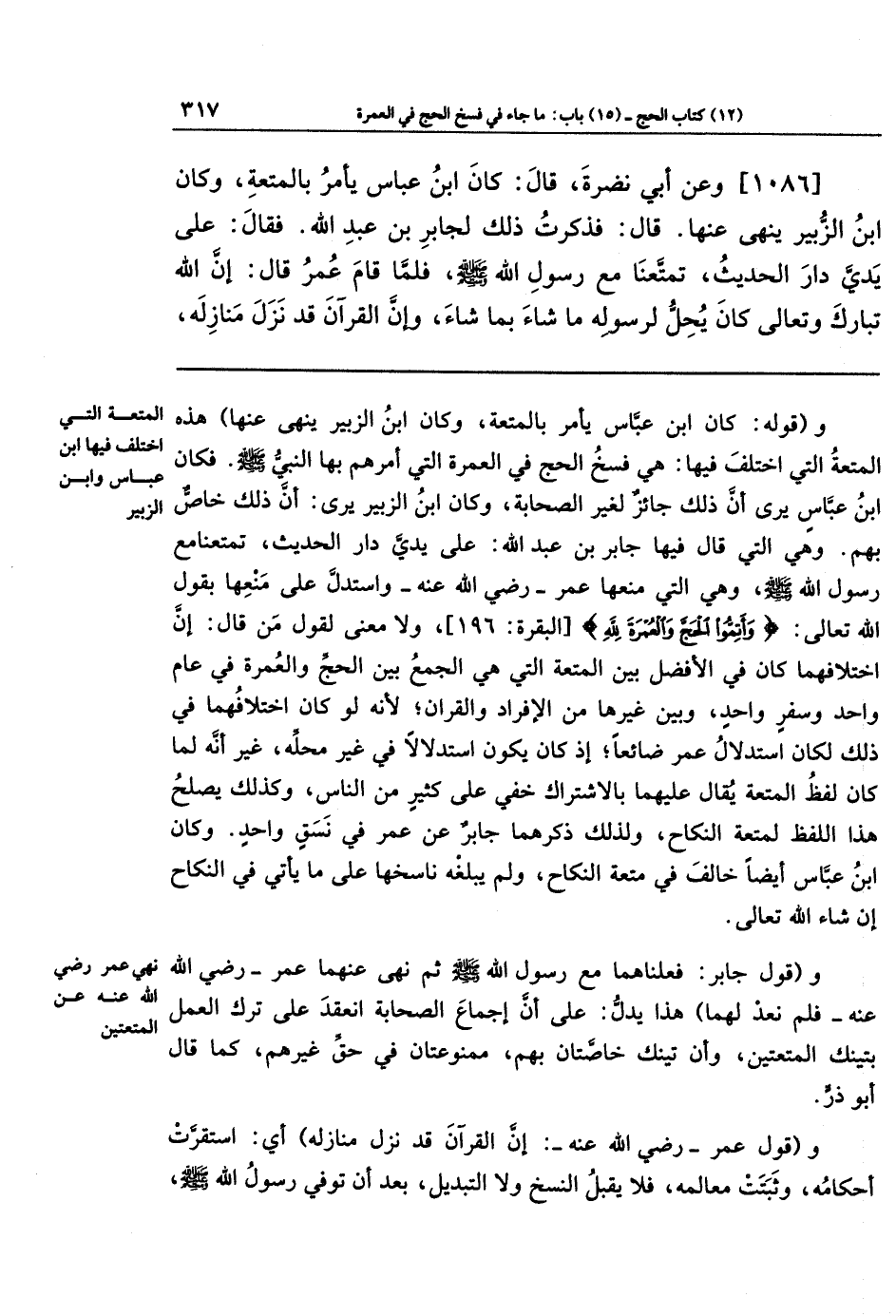 [1086] وعَن أَبِي نَضرَةَ قَالَ: كَانَ ابنُ عَبَّاسٍ يَأمُرُ بِالمُتعَةِ، وَكَانَ ابنُ الزُّبَيرِ يَنهَى عَنهَا. قَالَ: فَذَكَرتُ ذَلِكَ لِجَابِرِ بنِ عَبدِ اللَّهِ فَقَالَ: عَلَى يَدَيَّ دَارَ الحديث تَمَتَّعنَا مَعَ رَسُولِ اللَّهِ -صَلَّى اللَّهُ عَلَيهِ وَسَلَّمَ- فَلَمَّا قَامَ عُمَرُ قَالَ: إِنَّ اللَّهَ تبارك وتعالى كَانَ يُحِلُّ لِرَسُولِهِ مَا شَاءَ بِمَا شَاءَ، وَإِنَّ القُرآنَ قَد نَزَلَ مَنَازِلَهُ،