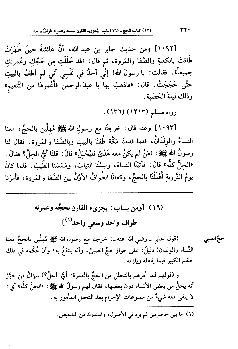 [1092] ومن حديث جابر بن عبد الله، أن عائشة حين طهرت طافت بالكعبة والصفا والمروة، ثم قال: قَد حَلَلتِ مِن حَجِّكِ وَعُمرَتِكِ جَمِيعًا، فَقَالَت: يَا رَسُولَ اللَّهِ! إِنِّي أَجِدُ فِي نَفسِي أَنِّي لَم أَطُف بِالبَيتِ حَتَّى حَجَجتُ قَالَ: فَاذهَب بِهَا يَا عَبدَ الرَّحمَنِ فَأَعمِرهَا مِن التَّنعِيمِ، وَذَلِكَ لَيلَةَ الحَصبَةِ.