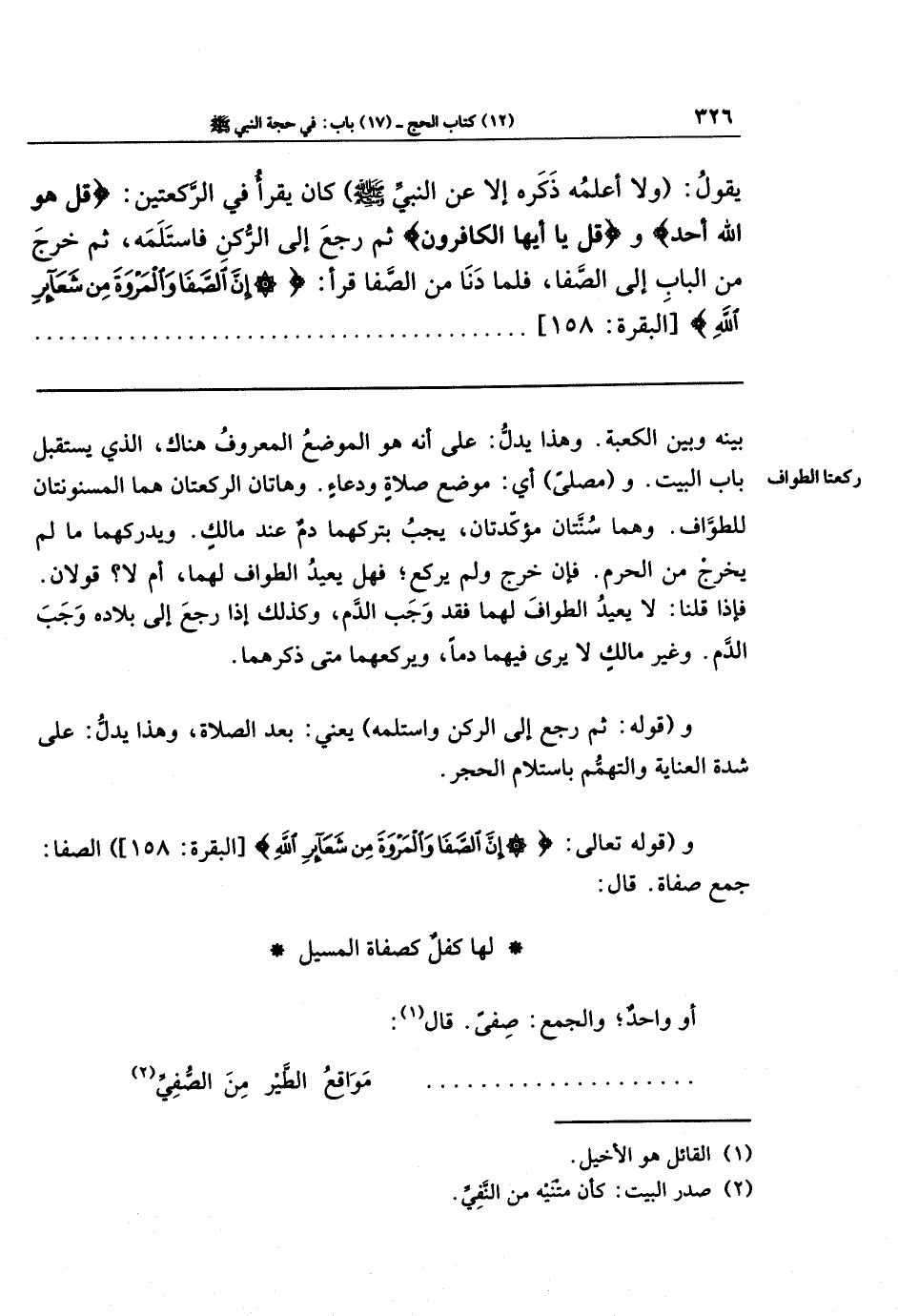 و(مُصَلًّى) أي: موضع صلاة ودعاء. وهاتان الركعتان هما المسنونتان للطُوَّاف. وهما سنتان مؤكدتان، يجب بتركهما دم عند مالك. ويدركهما ما لم يخرج من الحرم. فإن خرج ولم يركع؛ فهل يعيد الطواف لهما، أم لا؟ قولان. فإذا قلنا: لا يعيد الطواف لهما فقد وجب الدَّم، وكذلك إذا رجع إلى بلاده وجب الدَّم. وغير مالك لا يرى فيهما دمًا، ويركعهما متى ذكرهما.