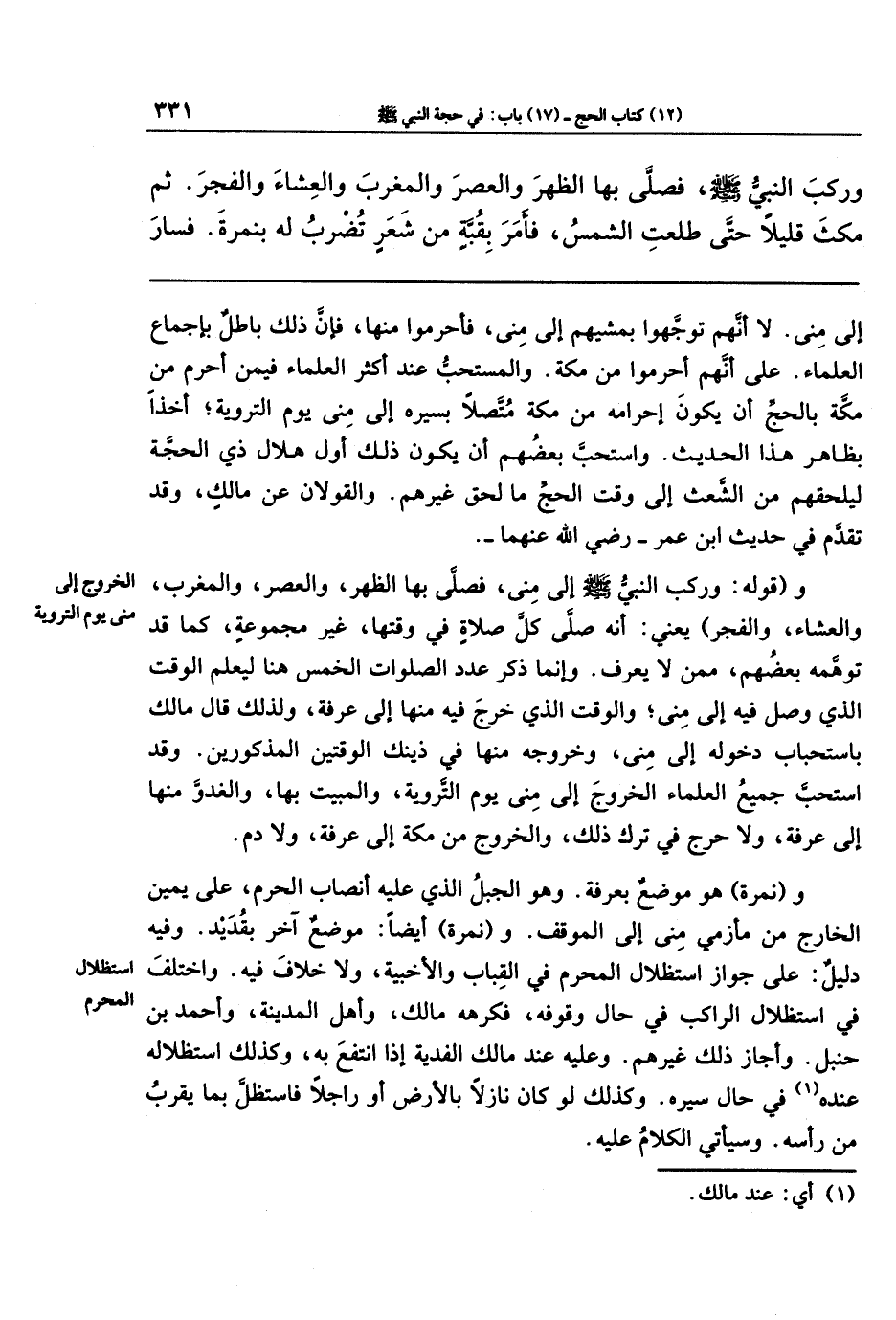 وقوله: وركب النبي - صلى الله عليه وسلم - إلى منى، فصلَّى بها الظهر، والعصر، والمغرب، والعشاء، والفجر؛ يعني: أنه صلَّى كل صلاة في وقتها، غير مجموعة، كما قد توهمه بعضهم، ممن لا يعرف. وإنما ذكر عدد الصلوات الخمس هنا ليعلم الوقت الذي وصل فيه إلى منى، والوقت الذي خرج فيه منها إلى عرفة، ولذلك قال مالك باستحباب دخوله إلى منى، وخروجه منها في ذينك الوقتين المذكورين. وقد استحب جميع العلماء الخروج إلى منى يوم التروية، والمبيت بها، والغدوَّ منها إلى عرفة، ولا حرج في ترك ذلك، والخروج من مكة إلى عرفة، ولا دم.