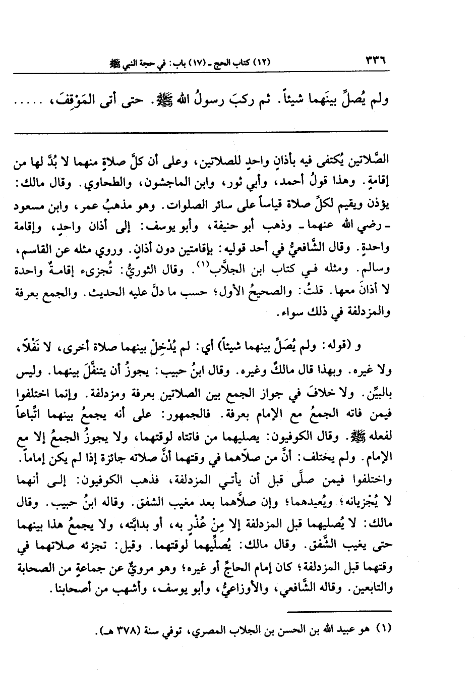 الصلاتين يُكتفى فيه بأذانٍ واحدٍ للصلاتين، وعلى أن كل صلاة منهما لا بدَّ لها من إقامة. وهذا قول أحمد، وأبي ثور، وابن الماجشون، والطحاوي. وقال مالك: يؤذن ويقيم لكل صلاة قياسًا على سائر الصلوات. وهو مذهب عمر، وابن مسعود رضي الله عنهما، وذهب أبو حنيفة وأبو يوسف: إلى أذان واحدٍ، وإقامة واحدة. وقال الشافعي في أحد قوليه: بإقامتين دون أذان. وروي مثله عن القاسم، وسالم. ومثله في كتاب ابن الجلاَّب (¬1). وقال الثوري: تُجزئ إقامة واحدة لا أذان معها.