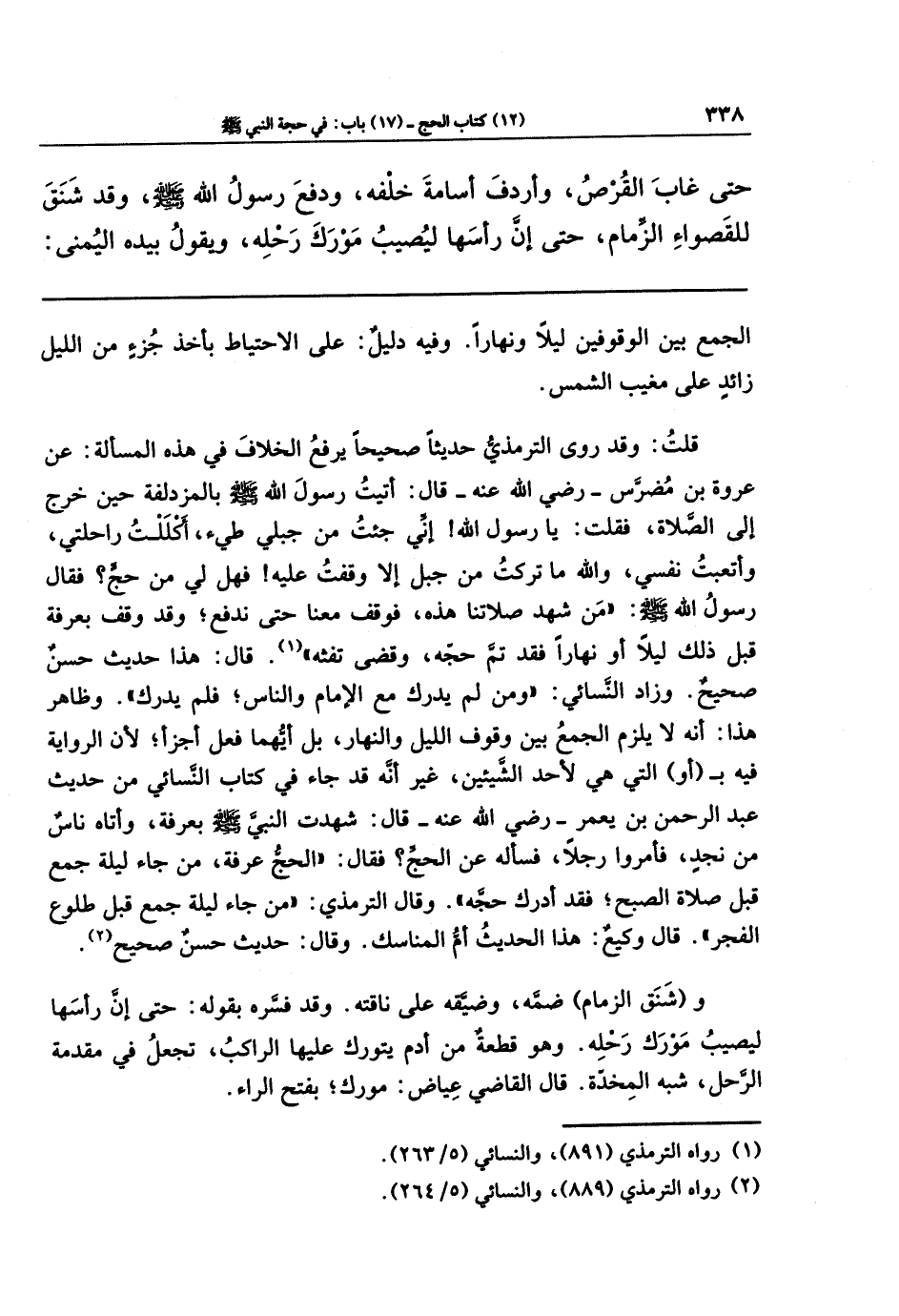 قلت: وقد روى الترمذي حديثًا صحيحًا يرفع الخلاف في هذه المسألة: عن عروة بن مُضرَّس - رضي الله عنه - قال: أتيت رسول الله - صلى الله عليه وسلم - بالمزدلفة حين خرج إلى الصَّلاة، فقلت: يا رسول الله! إني جئت من جبلي طيء، أكلَلتُ راحلتي، وأتعبت نفسي، والله ما تركت من جبل إلا وقفت عليه، فهل لي من حج؟ فقال رسول الله - صلى الله عليه وسلم -: (من شهد صلاتنا هذه، فوقف معنا حتى ندفع، وقد وقف بعرفة قبل ذلك ليلاً أو نهارًا فقد تم حجه، وقضى تفثه) (¬1). قال: هذا حديث حسن صحيح. وزاد النسائي: (ومن لم يدرك مع الإمام والناس؛ فلم يدرك) وظاهر هذا: أنه لا يلزم الجمع بين وقوف الليل والنهار، بل أيُّهما فعل أجزأ؛ لأن الرواية فيه بـ (أو) التي هي لأحد الشيئين، غير أنه قد جاء في كتاب النسائي من حديث عبد الرحمن بن يعمر رضي الله عنه قال: شهدت النبي - صلى الله عليه وسلم - بعرفة، وأتاه ناس من نجد، فأمروا رجلاً، فسأله عن الحج؟ فقال: (الحج عرفة، من جاء ليلة جمع قبل صلاة الصبح، فقد أدرك حجه). وقال الترمذي: (من جاء ليلة جمع قبل طلوع الفجر). قال وكيع: هذا الحديث أُمُّ المناسك. وقال: حديث حسن صحيح (¬2).