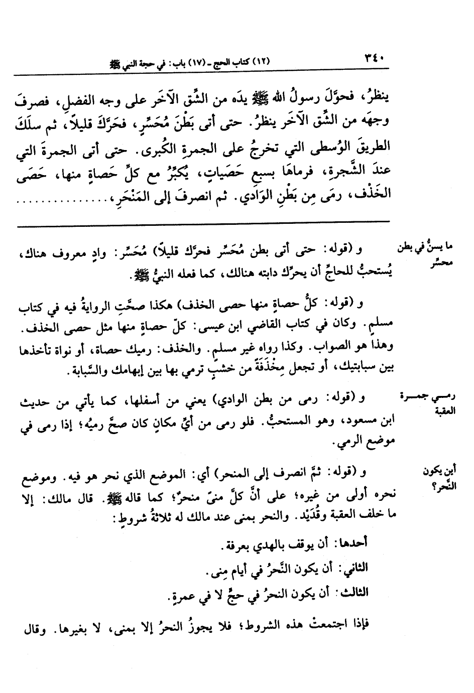 يَنظُرُ، فَحَوَّلَ رَسُولُ اللَّهِ - صَلَّى اللَّهُ عَلَيهِ وَسَلَّمَ- يَدَهُ مِن الشِّقِّ الآخَرِ عَلَى وَجهِ الفَضلِ، فَصرِف وَجهَهُ مِن الشِّقِّ الآخَرِ يَنظُرُ. حَتَّى أَتَى بَطنَ مُحَسِّرٍ، فَحَرَّكَ قَلِيلاً، ثُمَّ سَلَكَ الطَّرِيقَ الوُسطَى الَّتِي تَخرُجُ عَلَى الجَمرَةِ الكُبرَى، حَتَّى أَتَى الجَمرَةَ الَّتِي عِندَ الشَّجَرَةِ، فَرَمَاهَا بِسَبعِ حَصَيَاتٍ، يُكَبِّرُ مَعَ كُلِّ حَصَاةٍ مِنهَا، حَصَى الخَذفِ، رَمَى مِن بَطنِ الوَادِي، ثُمَّ انصَرَفَ إِلَى المَنحَرِ،