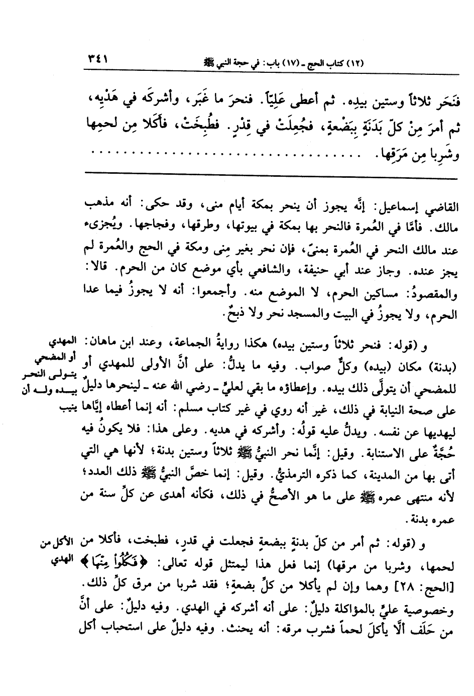 وقوله: (فنحر ثلاثًا وستين بيده) هكذا رواية الجماعة، وعند ابن ماهان: (بدنة) مكان (بيده)، وكلٌّ صواب. وفيه ما يدل على أن الأولى للمهدي أو للمضحي أن يتولى ذلك بيده.