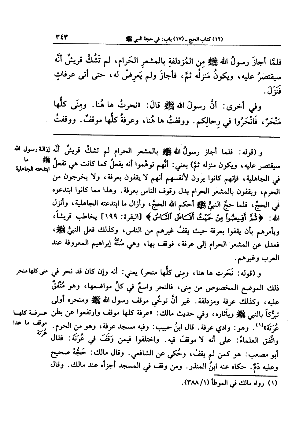 وقوله: (نحرت هاهنا، ومنى كلها منحر)؛ يعني: أنه وإن كان قد نحر في ذلك الموضع المخصوص من منى، فالنحر واسع في كل مواضعها، وهو متفق عليه، وكذلك عرفة ومزدلفة. غير أن توخي موقف رسول الله - صلى الله عليه وسلم - ومنحره أولى تبرُّكًا بالنبي - صلى الله عليه وسلم - وبآثاره، وفي حديث مالك: (عرفة كلها موقف، وارتفعوا عن بطن عُرَنَة) (¬1) وهو وادي عرفة. قال ابن حبيب: وفيه مسجد عرفة، وهو من الحرم. واتفق العلماء: على أنه لا موقف فيه. واختلفوا فيمن وقف في عُرَنَة: فقال أبو مصعب: هو كمن لم يقف، وحكي عن الشافعي. وقال مالك: حَجُّه صحيح وعليه دم. حكاه عنه ابن المنذر. ومن وقف في المسجد أجزأه عند مالك. وقال