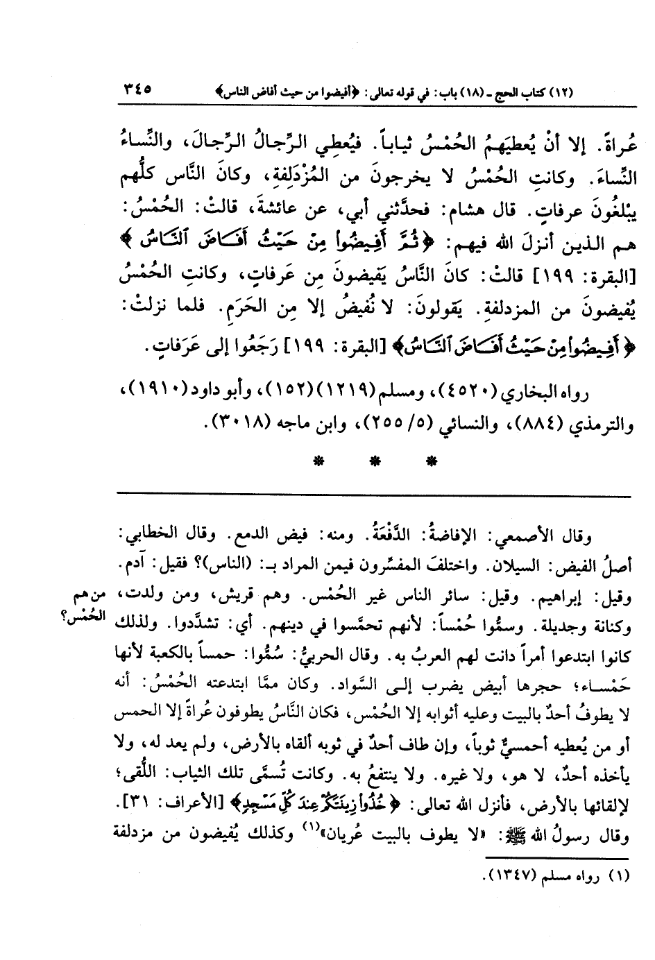 عُرَاةً، إِلَّا أَن يُعطِيَهُم الحُمسُ ثِيَابًا، فَيُعطِي الرِّجَالُ الرِّجَالَ، وَالنِّسَاءُ النِّسَاءَ. وَكَانَت الحُمسُ لَا يَخرُجُونَ مِن المُزدَلِفَةِ، وَكَانَ النَّاسُ كُلُّهُم يَبلُغُونَ عَرَفَاتٍ، قَالَ هِشَامٌ: فَحَدَّثَنِي أَبِي عَن عَائِشَةَ قَالَت: الحُمسُ هُم الَّذِينَ أَنزَلَ اللَّهُ فِيهِم: {ثُمَّ أَفِيضُوا مِن حَيثُ أَفَاضَ النَّاسُ} قَالَت: كَانَ النَّاسُ يُفِيضُونَ مِن عَرَفَاتٍ، وَكَانَت الحُمسُ يُفِيضُونَ مِن المُزدَلِفَةِ. يَقُولُونَ لَا نُفِيضُ إِلَّا مِن الحَرَمِ. فَلَمَّا نَزَلَت: {أَفِيضُوا مِن حَيثُ أَفَاضَ النَّاسُ} رَجَعُوا إِلَى عَرَفَاتٍ.