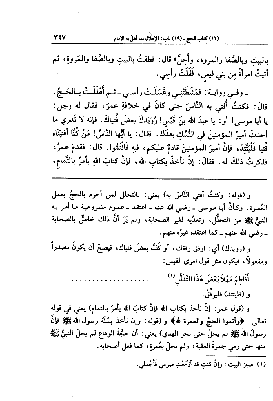 - وَفِي رِوَايَةٍ: فمشطتني وغسلت رأسي - ثُمَّ أَهلَلتُ بِالحَجِّ، قَالَ: فَكُنتُ أُفتِي بِهِ النَّاسَ حَتَّى كَانَ فِي خِلَافَةِ عُمَرَ، فَقَالَ لَهُ رَجُلٌ: يَا أَبَا مُوسَى (أَو: يَا عَبدَ اللَّهِ بنَ قَيسٍ) رُوَيدَكَ بَعضَ فُتيَاكَ، فَإِنَّكَ لَا تَدرِي مَا أَحدَثَ أَمِيرُ المُؤمِنِينَ فِي النُّسُكِ بَعدَكَ، فَقَالَ: يَا أَيُّهَا النَّاسُ مَن كُنَّا أَفتَينَاهُ فُتيَا فَليَتَّئِد، فَإِنَّ أَمِيرَ المُؤمِنِينَ قَادِمٌ عَلَيكُم، فَبِهِ فَأتَمُّوا، قَالَ: فَقَدِمَ عُمَرُ، فَذَكَرتُ ذَلِكَ له. فَقَالَ: إِن نَأخُذ بِكِتَابِ اللَّهِ، فَإِنَّ كِتَابَ اللَّهِ يَأمُرُ بِالتَّمَامِ،