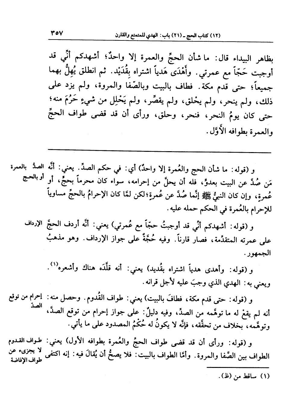 بِظَاهِرِ البَيدَاءِ قَالَ: مَا شَأنُ الحَجِّ وَالعُمرَةِ إِلَّا وَاحِدٌ، أُشهِدُكُم أَنِّي قَد أَوجَبتُ حَجًّا مَعَ عُمرَتِي، وَأَهدَى هَديًا اشتَرَاهُ بِقُدَيدٍ، ثُمَّ انطَلَقَ يُهِلُّ بِهِمَا جَمِيعًا، حَتَّى قَدِمَ مَكَّةَ، فَطَافَ بِالبَيتِ وَبِالصَّفَا وَالمَروَةِ، وَلَم يَزِد عَلَى ذَلِكَ وَلَم يَنحَر، وَلَم يَحلِق، وَلَم يُقَصِّر وَلَم يَحلِل مِن شَيءٍ حَرُمَ مِنهُ، حَتَّى كَانَ يَومُ النَّحرِ فَنَحَرَ، وَحَلَقَ، وَرَأَى أَن قَد قَضَى طَوَافَ الحَجِّ، وَالعُمرَةِ بِطَوَافِهِ الأَوَّلِ.