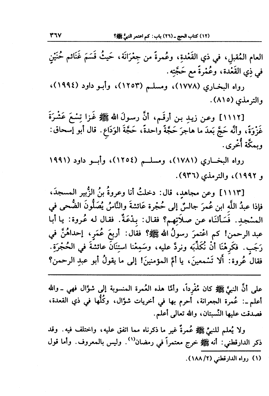 [1113] وعَن مُجَاهِدٍ، قَالَ: دَخَلتُ أَنَا، وَعُروَةُ بنُ الزُّبَيرِ المَسجِدَ، فَإِذَا عَبدُ اللَّهِ بنُ عُمَرَ جَالِسٌ إِلَى حُجرَةِ عَائِشَةَ، وَالنَّاسُ يُصَلُّونَ الضُّحَى فِي المَسجِدِ، فَسَأَلنَاهُ عَن صَلَاتِهِم؟ فَقَالَ: بِدعَةٌ، فَقَالَ: لَهُ عُروَةُ، يَا أَبَا عَبدِ الرَّحمَنِ كَم اعتَمَرَ رَسُولُ اللَّهِ -صَلَّى اللَّهُ عَلَيهِ وَسَلَّمَ-؟ فَقَالَ: أَربَعَ عُمَرٍ، إِحدَاهُنَّ فِي رَجَبٍ، فَكَرِهنَا أَن نُكَذِّبَهُ وَنَرُدَّ عَلَيهِ، وَسَمِعنَا استِنَانَ عَائِشَةَ فِي الحُجرَةِ، فَقَالَ عُروَةُ: أَلَا تَسمَعِينَ يَا أُمَّ المُؤمِنِينَ! إِلَى مَا يَقُولُ أَبُو عَبدِ الرَّحمَنِ؟